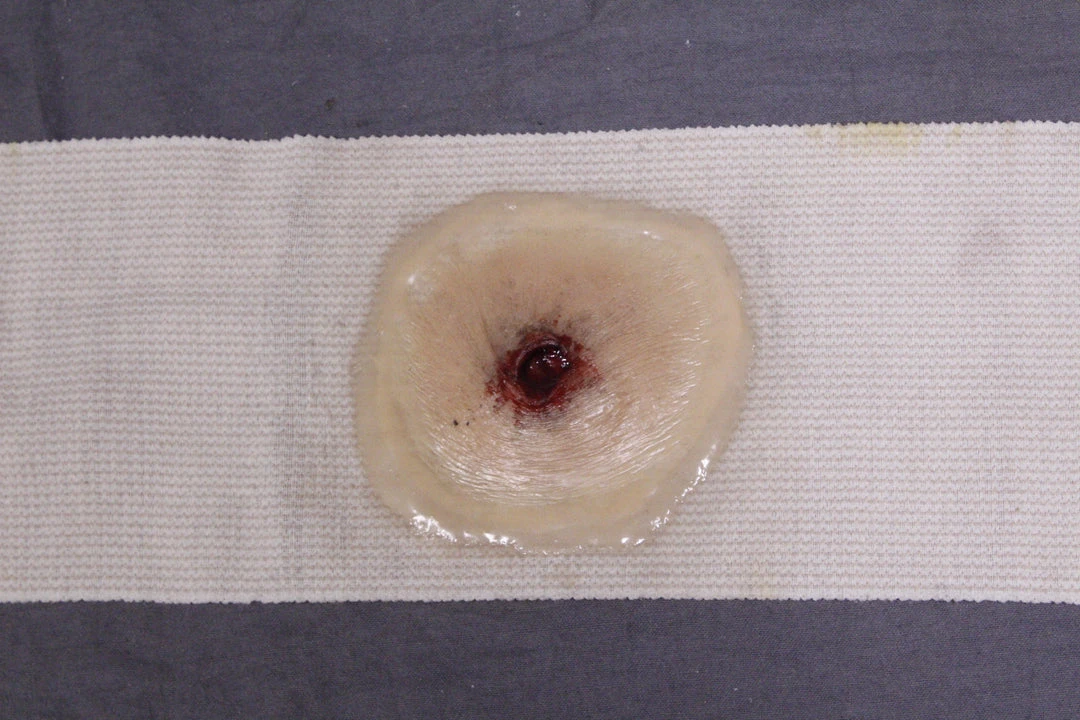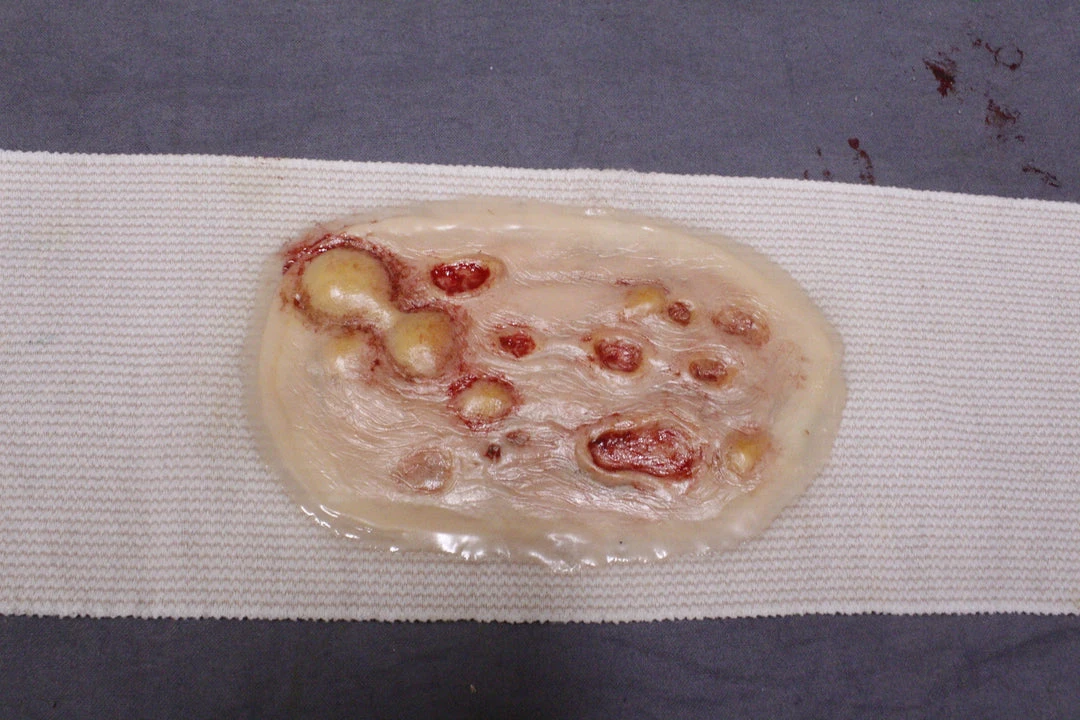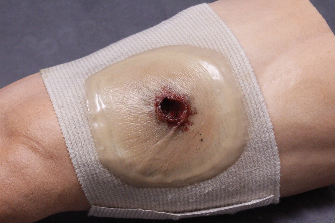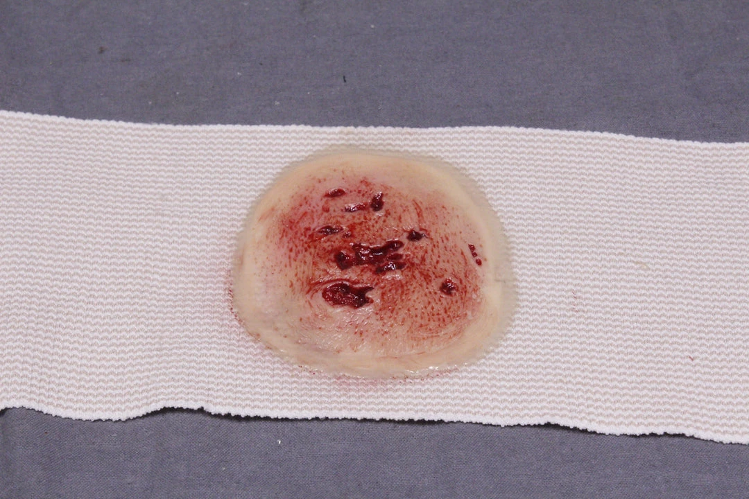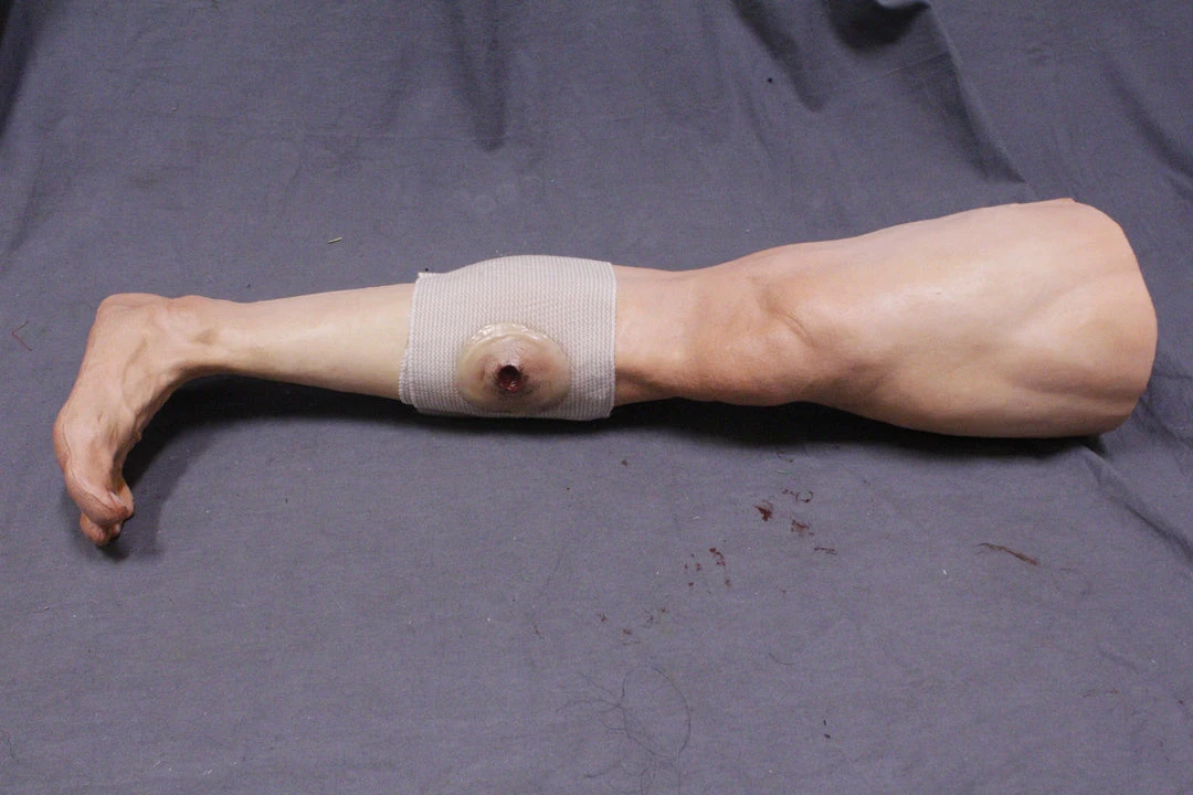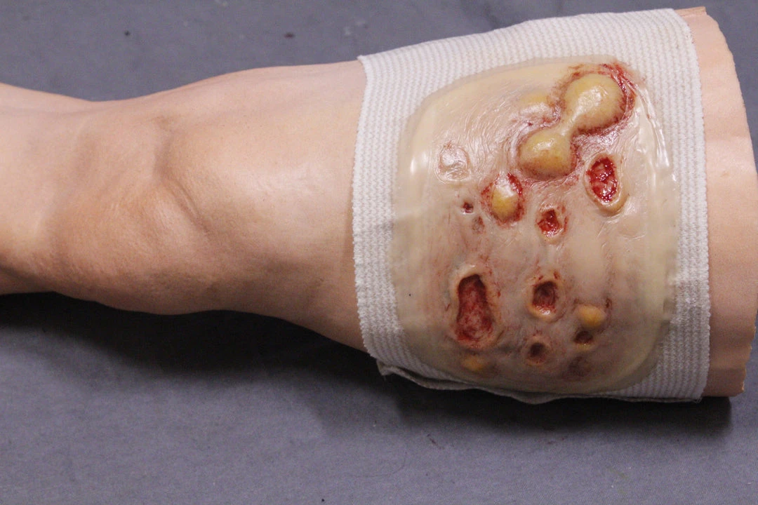Dura rubber moulage kit on elastic bands for strapping wounds to fake arms and legs. Great for training. Not a makeup product. It contains: