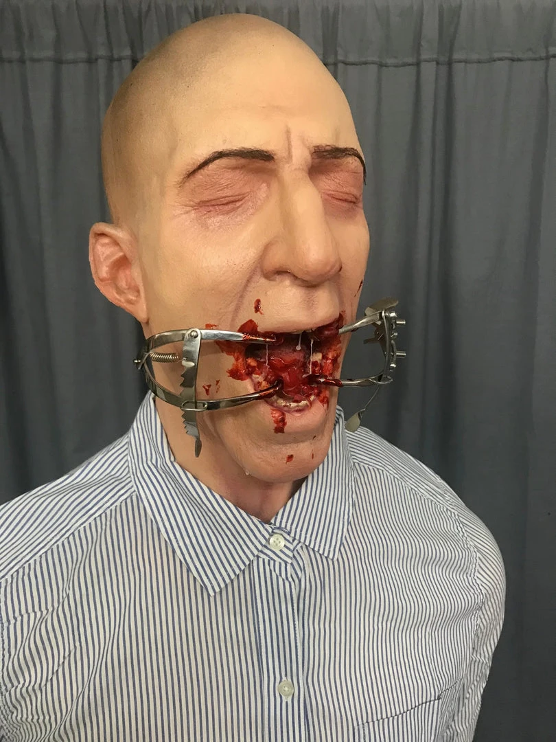 Lifesize standing dental horror figure. Features pained face with mouth held open with a bloody steel ratchet gag. Lifecast head and hands with poseable mannequin body.