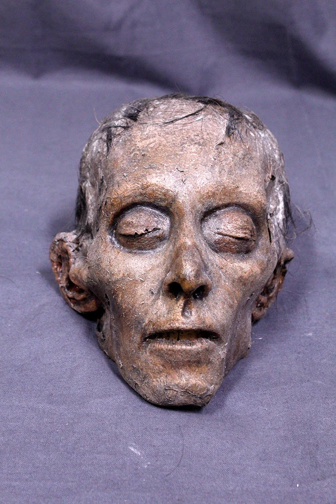 This lifesize mummified head features our lifecast Morgan face over a PVC skull.