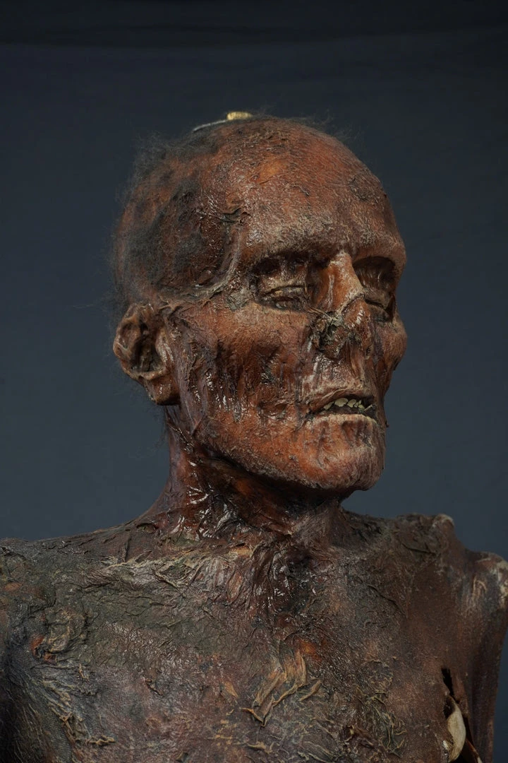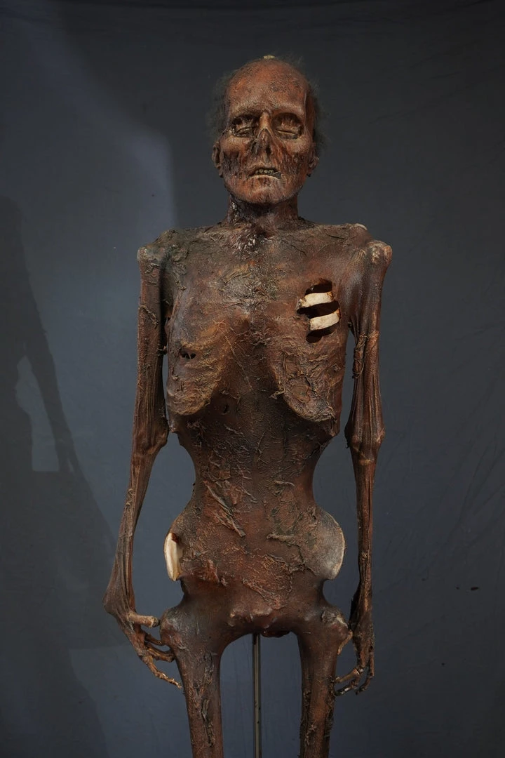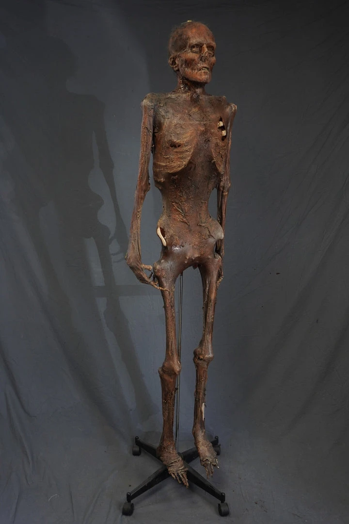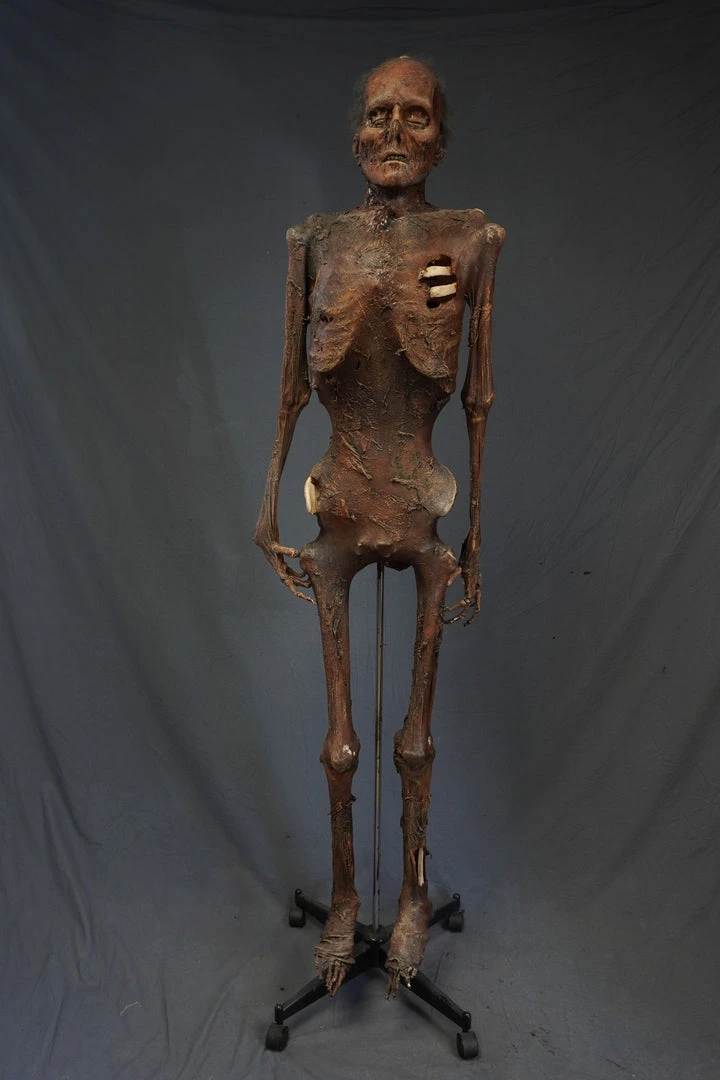 Mummified lifesize skeleton with realistic Nell face and super strong, super flexible, and super realistic skin. Skin is embedded with tear-resistant mesh. Great for situations such as haunts, escape rooms, and stunts, where stress and rough handling are expected.