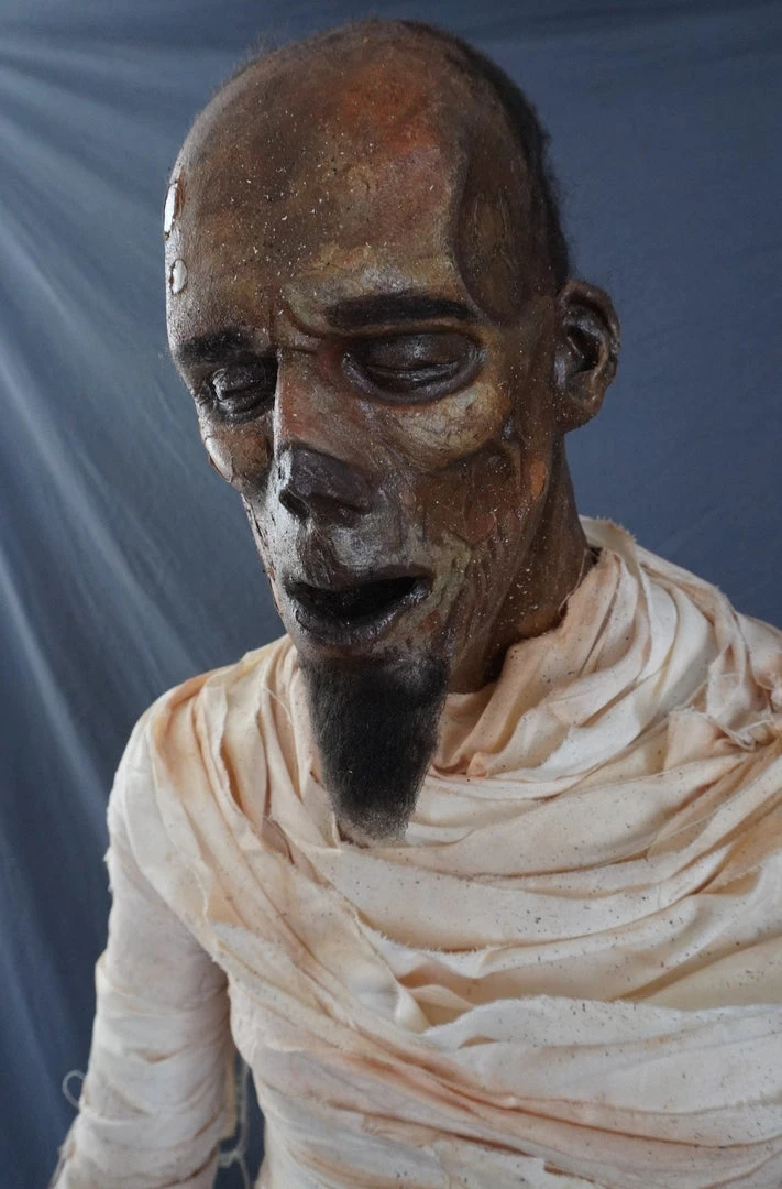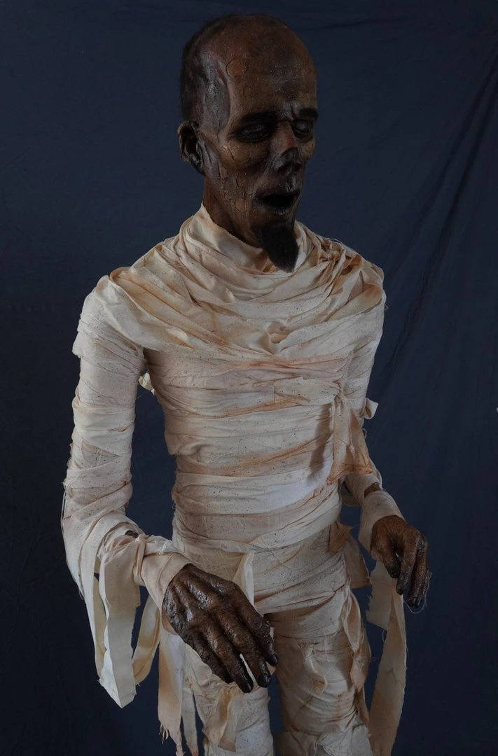 Lifesize standing bandage Egyptian mummy, complete with wrappings, lifecast head and poseable mannequin body.