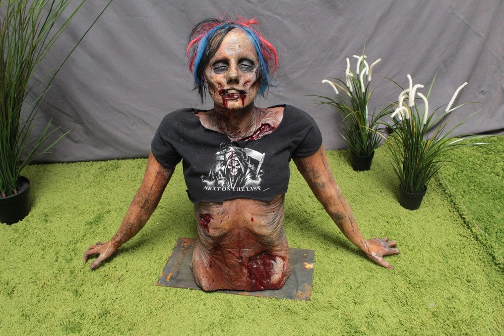 Freestanding gory female zombie torso will look great on your lawn! Includes heavy duty metal stand. 360 urethane prop.