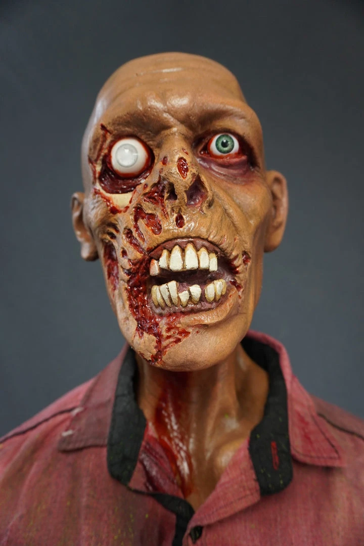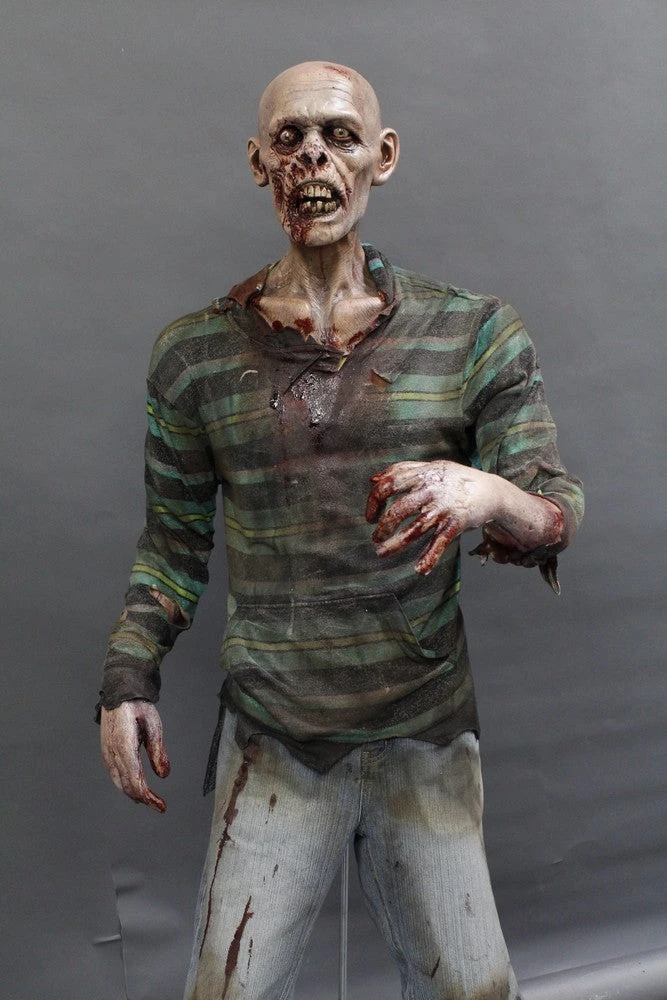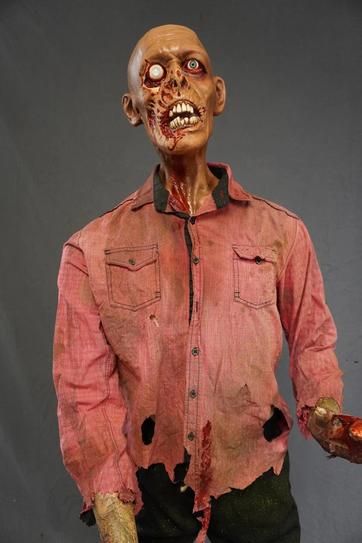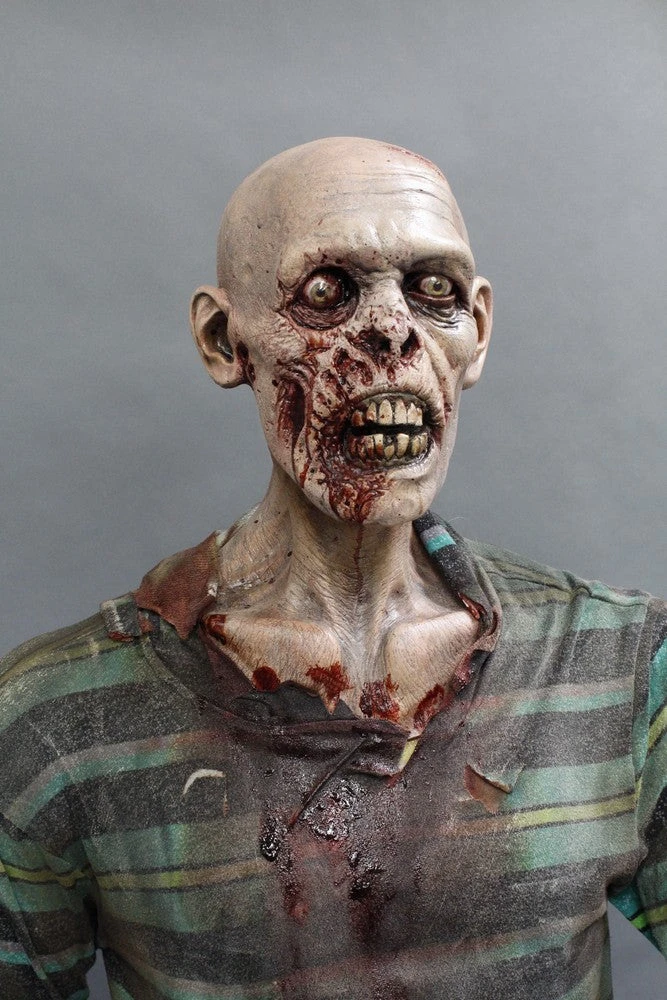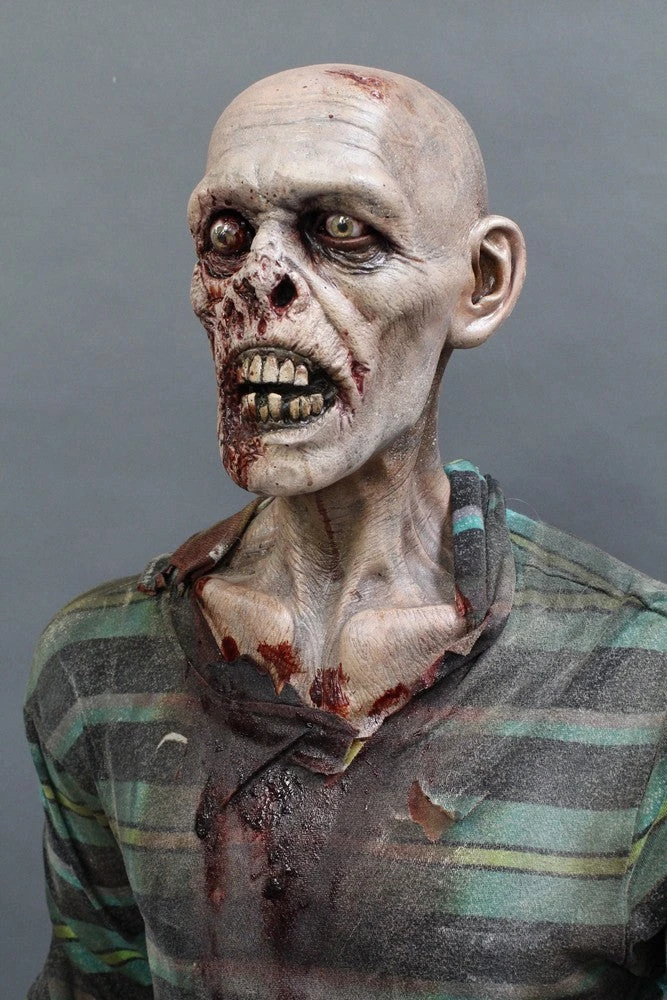 Lifesize standing zombie figure. Features a rotted face and nose, sunken eyes, and a open mouth exposing some teeth. Head on a bloody poseable mannequin body.