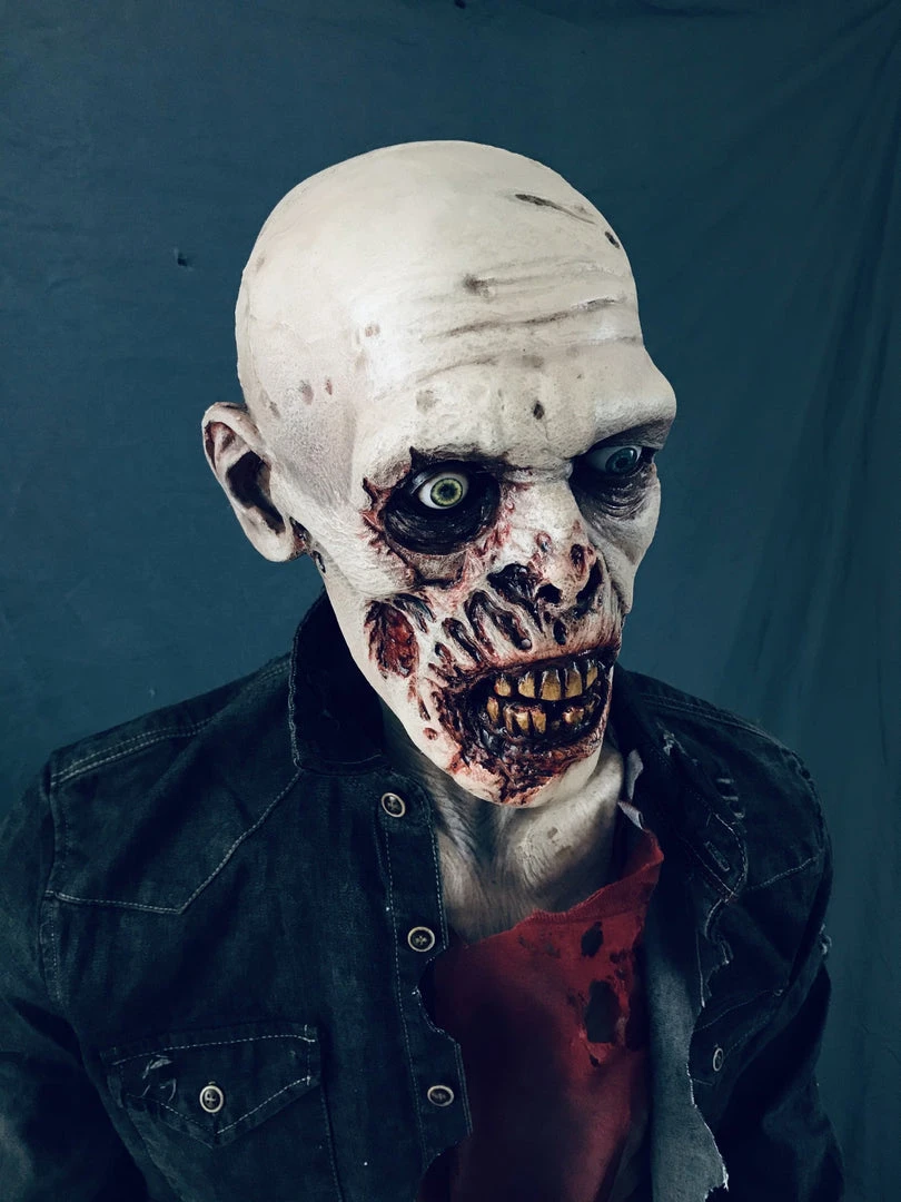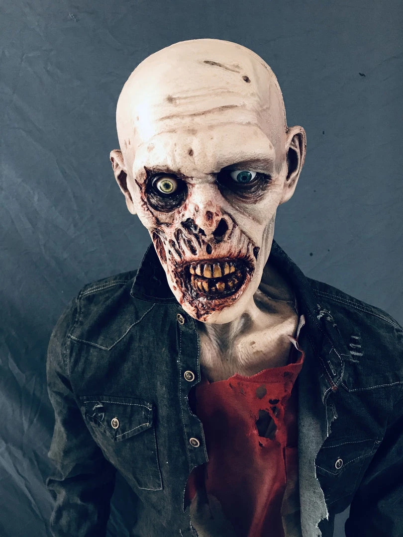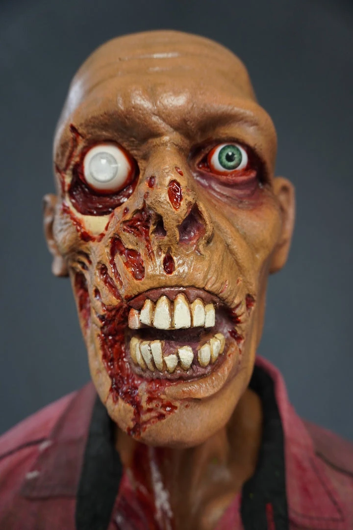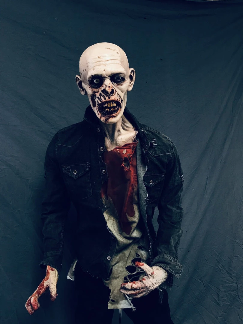 Lifesize standing zombie figure. Features a rotted face and nose, sunken eyes, and a open mouth exposing some teeth. Head on a bloody poseable mannequin body.