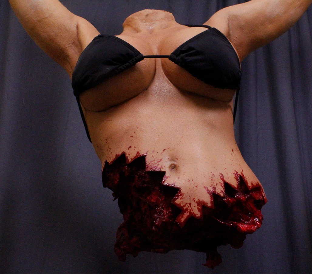 Fun photo op prop where an actor or guest can put their head through a curtain or hole and their friends can take pictures of them with a hanging, shark bitten gory torso. Reinforced internal armature.