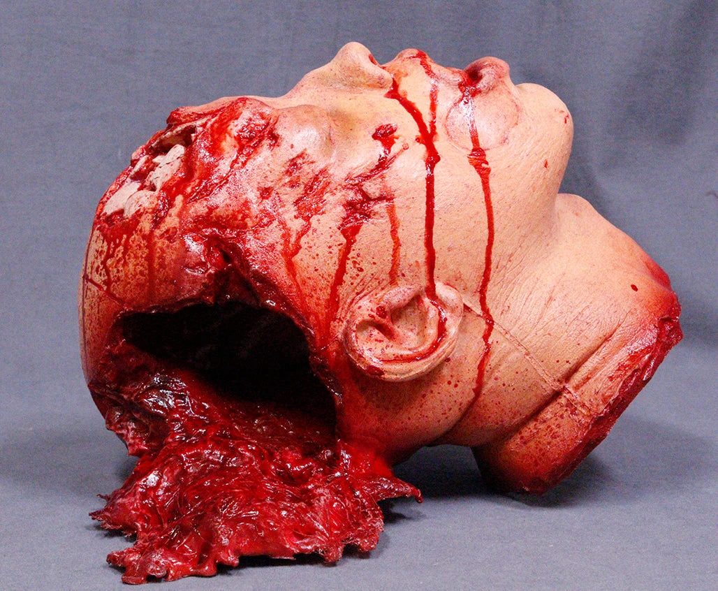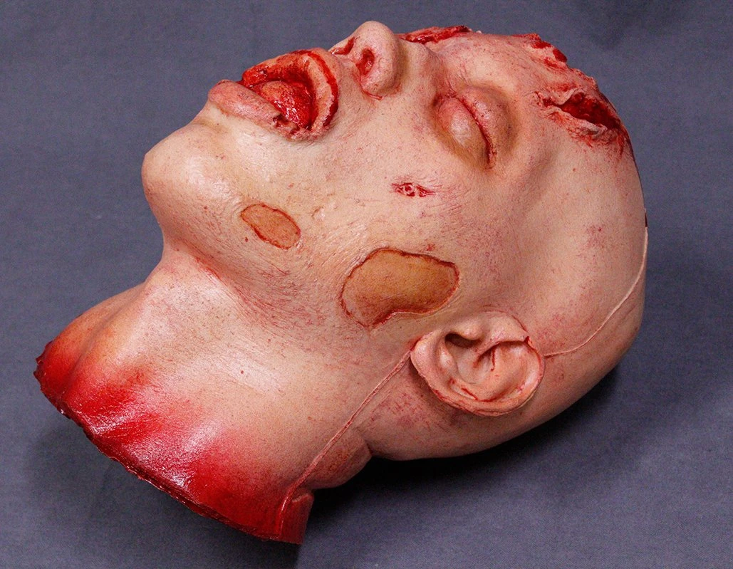 Lifecast urethane rubber head with realistic wounds and gore.