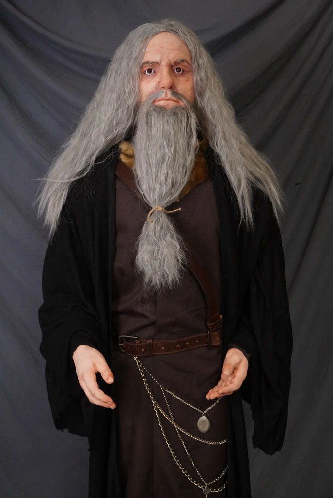 Lifesize standing wizard figure. Lifecast male head with long gray hair and beard and lifecast hands on a poseable mannequin body dressed in wizard robes with accessories. Perfect for your spooky haunted house, escape room or Halloween party.