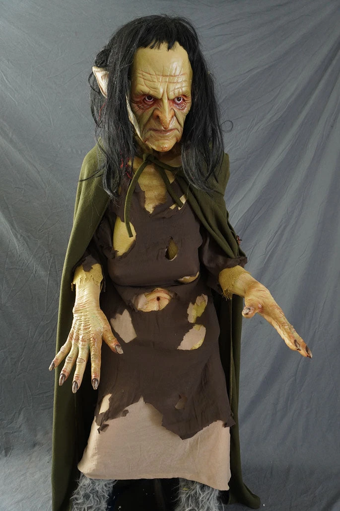 Lifesize forest witch figure. Features a sculpted head, torso and hands on a poseable mannequin body with a removable lightweight stand. Hooded cape can be worn open or closed.