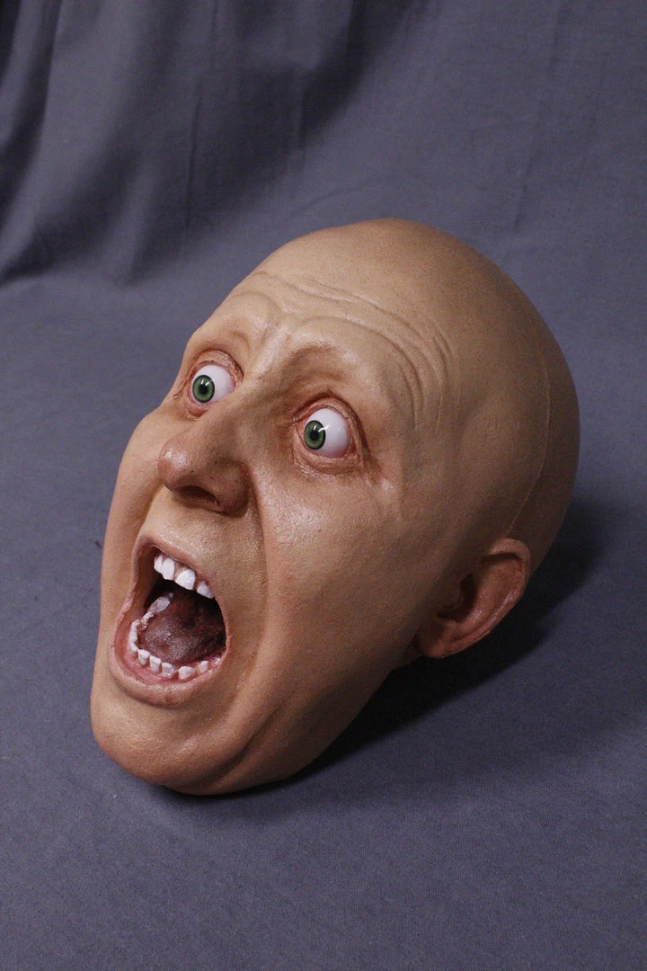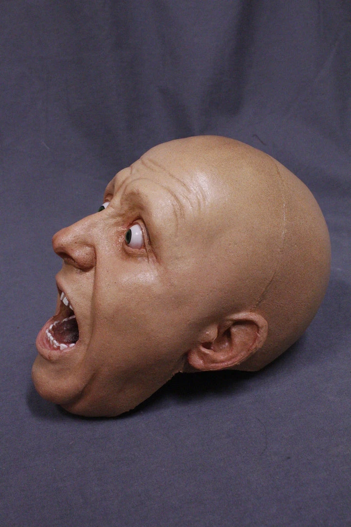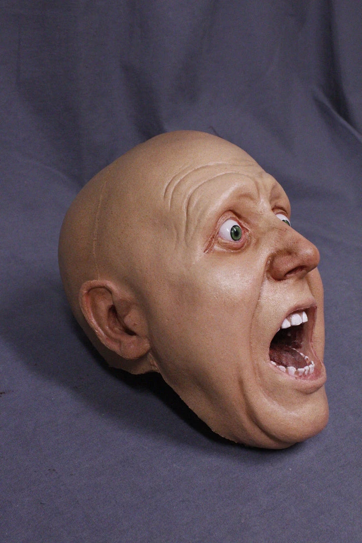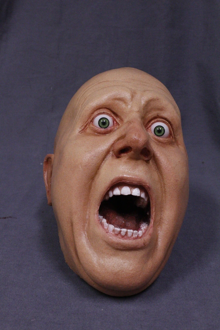 Male head with open eyes and open mouth, posed screaming in fear. Lifesize, cast in polyfoam rubber.