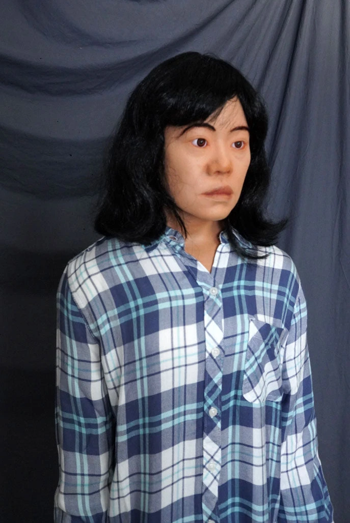 Poseable foam rubber body with lifecast female Asian May head and wig. This figure can sit and stand. Includes clothing and stand. Arms can rotate at the shoulder and swing up at the elbow. Realistic motion for fall stunt dummies and rescue dummies.