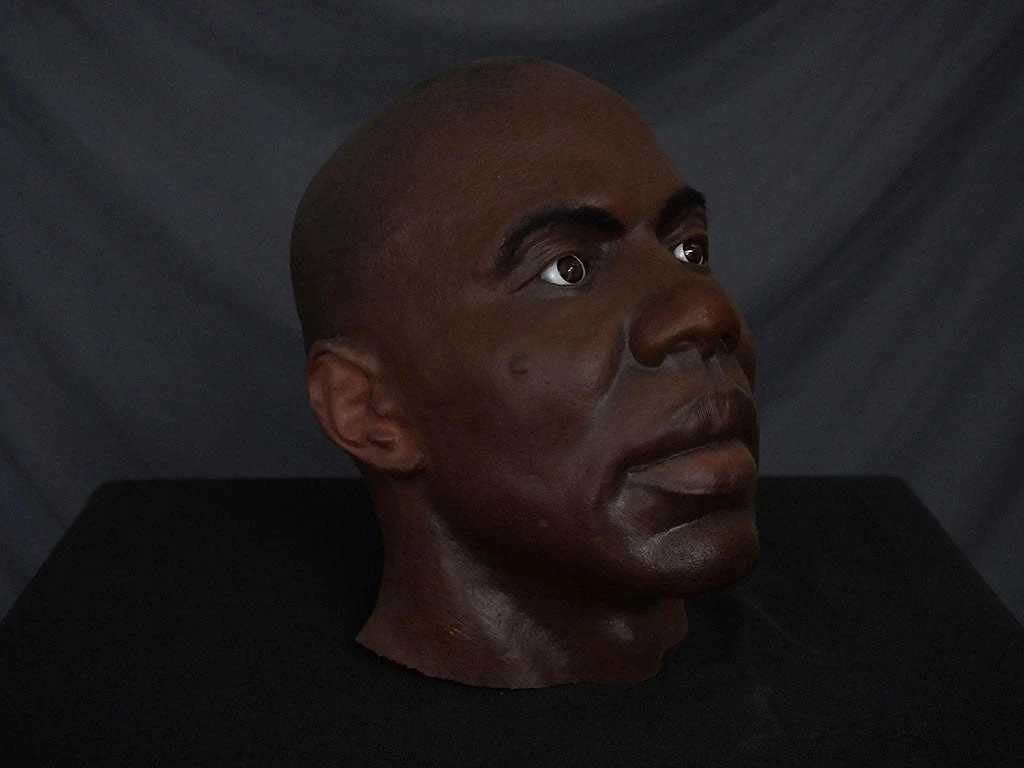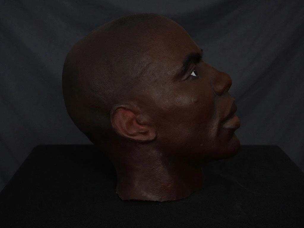 Lifecast African American male head with open eyes. Neck is cut above the shoulders and sealed with an embedded 1/4″ – 20 thread size coupling bolt so it can be easily mounted to standard tripods, certain mannequins, and any 1/4″ 20 thread rod.