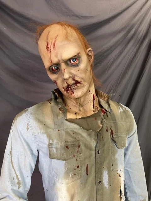 Lifesize standing zombie figure. Features a rotted face and nose, sunken eyes, and a open mouth exposing some teeth. Head on a bloody poseable mannequin body.