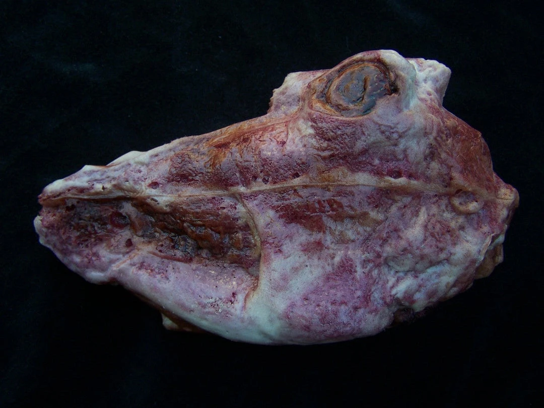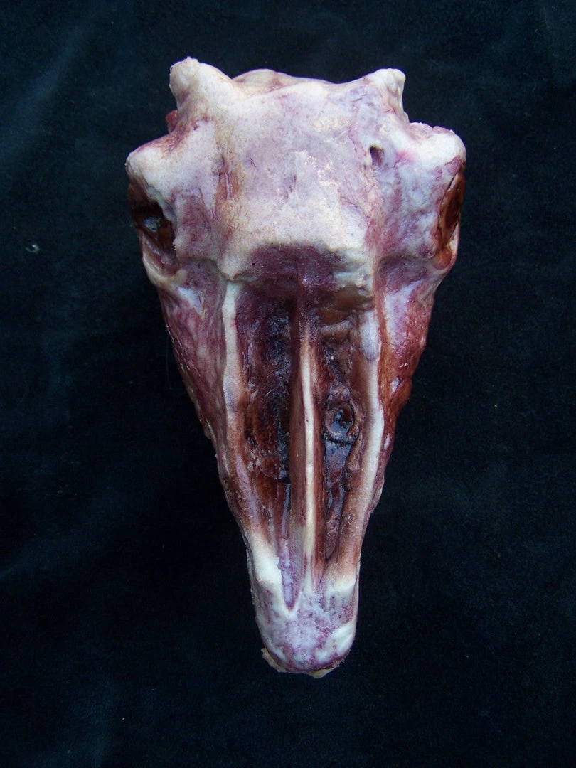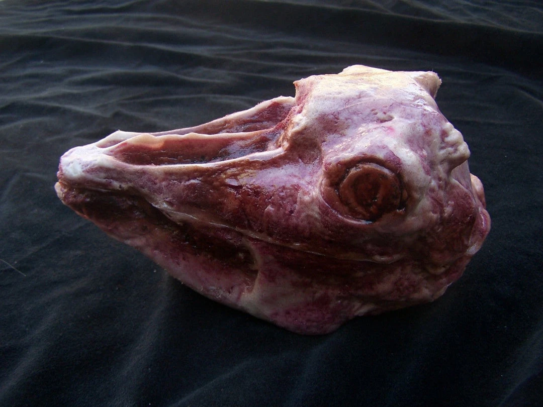 If you’re setting up a gory, bloody butcher shop, you don’t want to stock it only with pigs heads on hooks and offend the people who don’t eat pork. You need skinned goat heads. Plus, the little horn nubs and huge open sinuses look very monstrous. Lifesize. Product dimensions: 10″ x 6″ x 5″.
