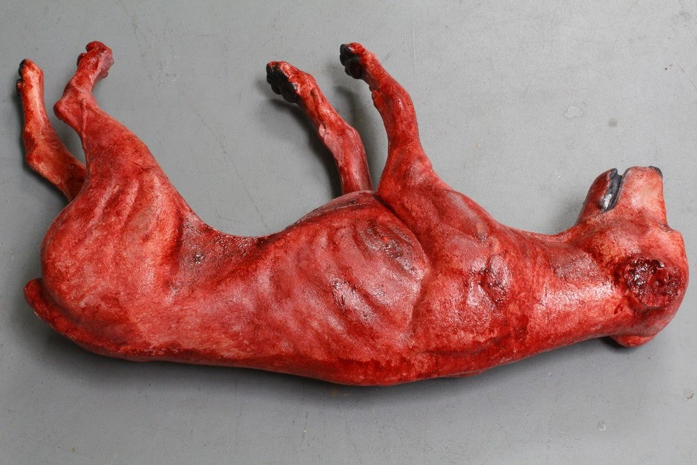 Lifesize belgian shepherd dog with bloody skin.