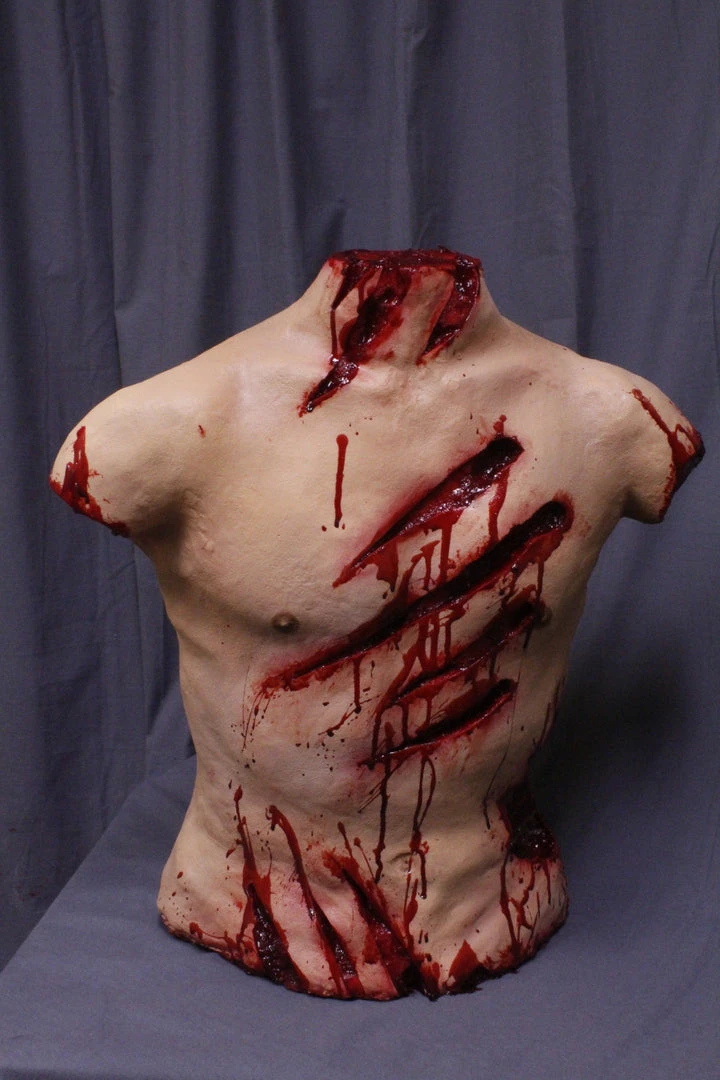 Lifecast muscular male torso with deep animal attack wounds.