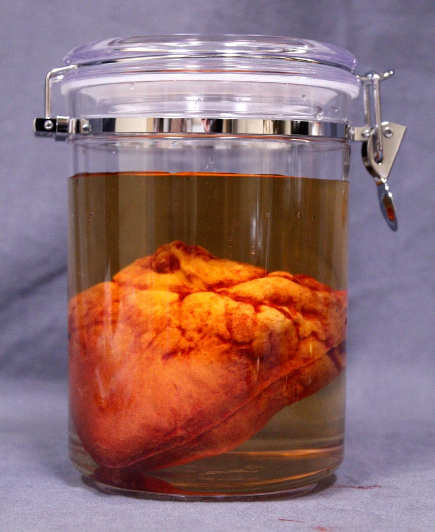 Small lifelike heart in cast in hollow urethane rubber in a shatterproof acrylic jar.