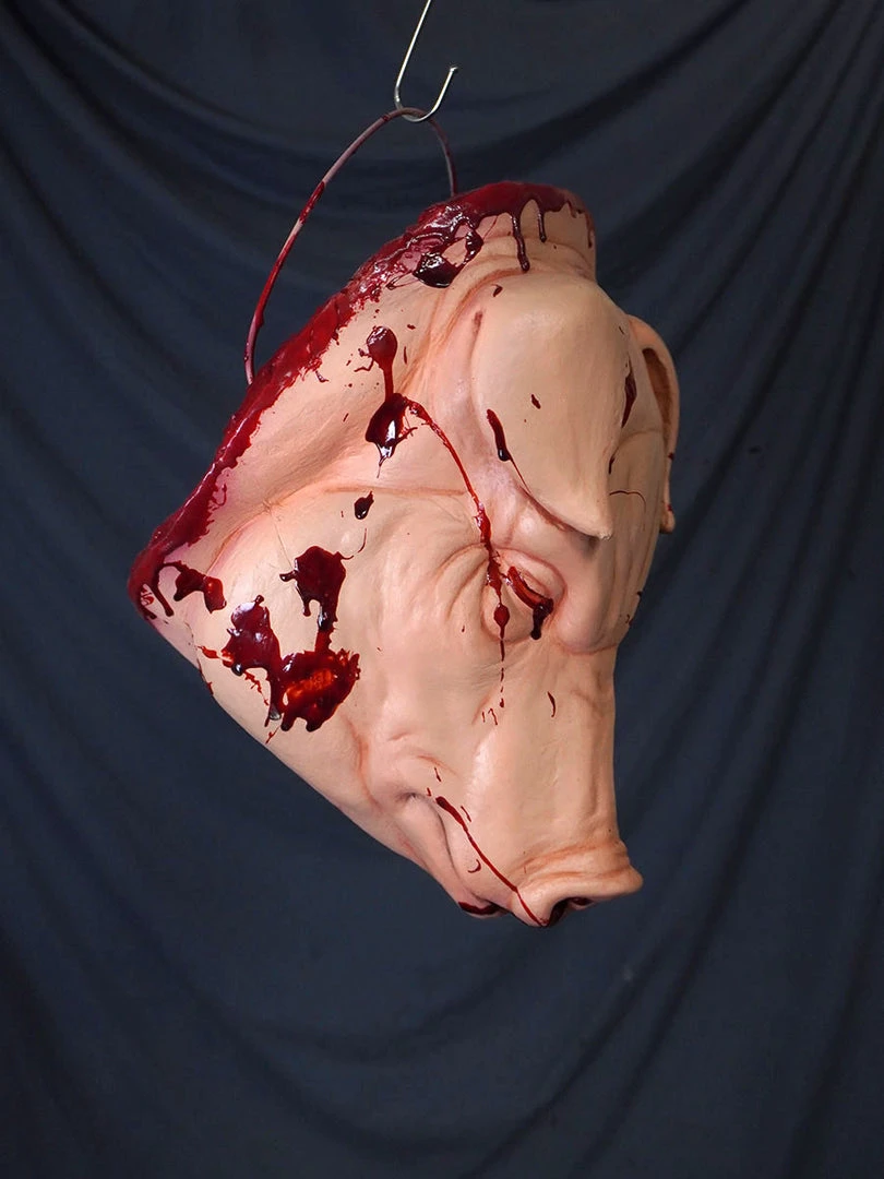 Splatter pig head is bloody and covered with cuts and wounds. Comes with a wire hook for hanging.