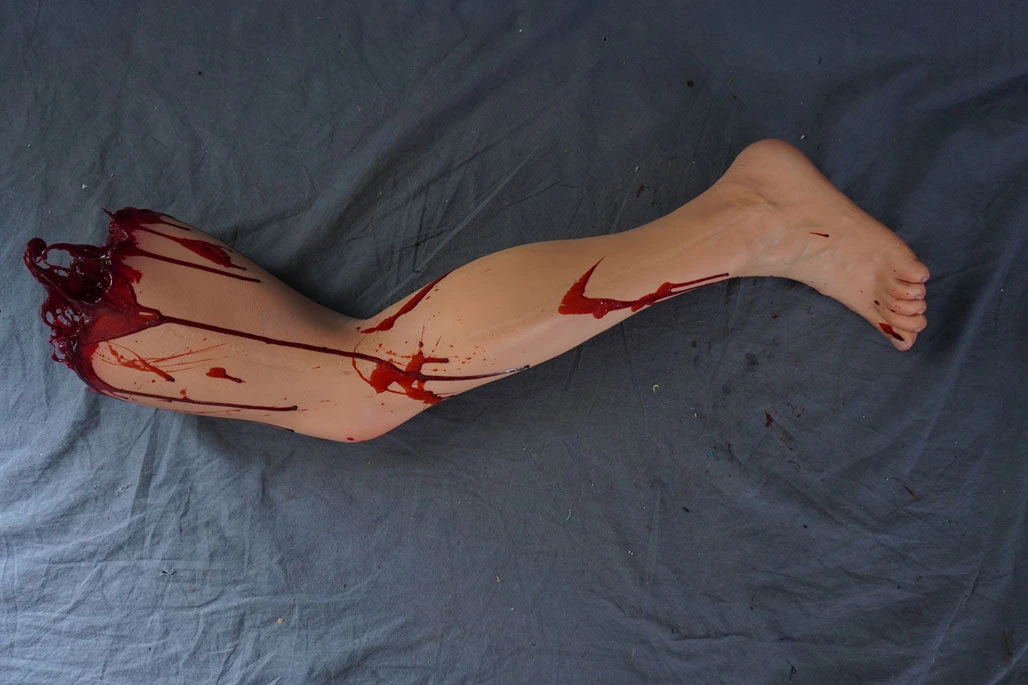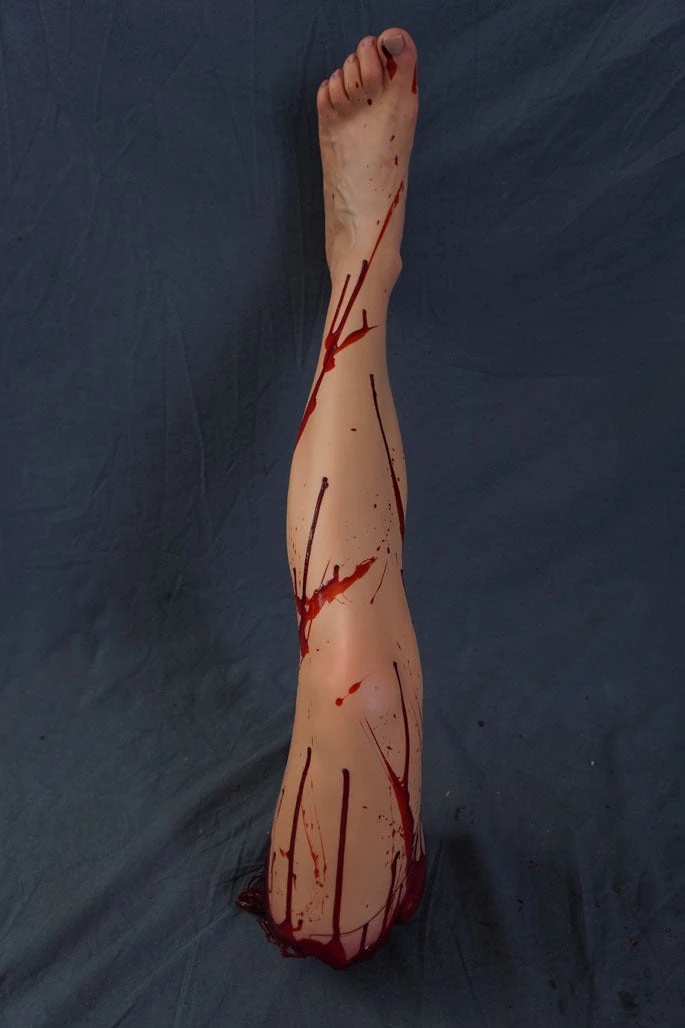 Full length life cast Hugo leg painted bloody with a variety of wounds and cuts. Left Leg only.