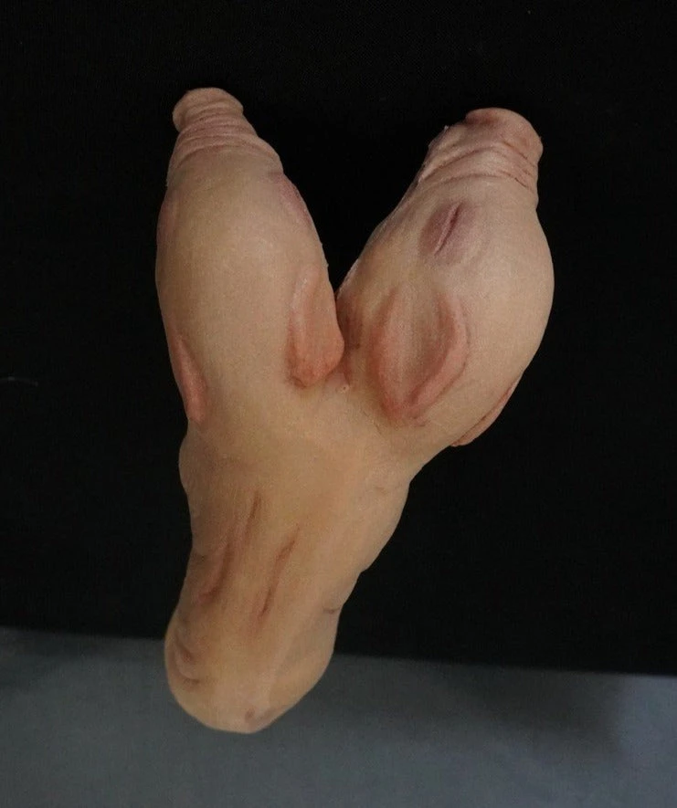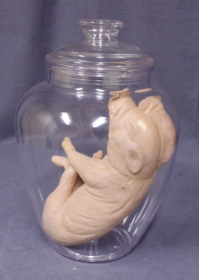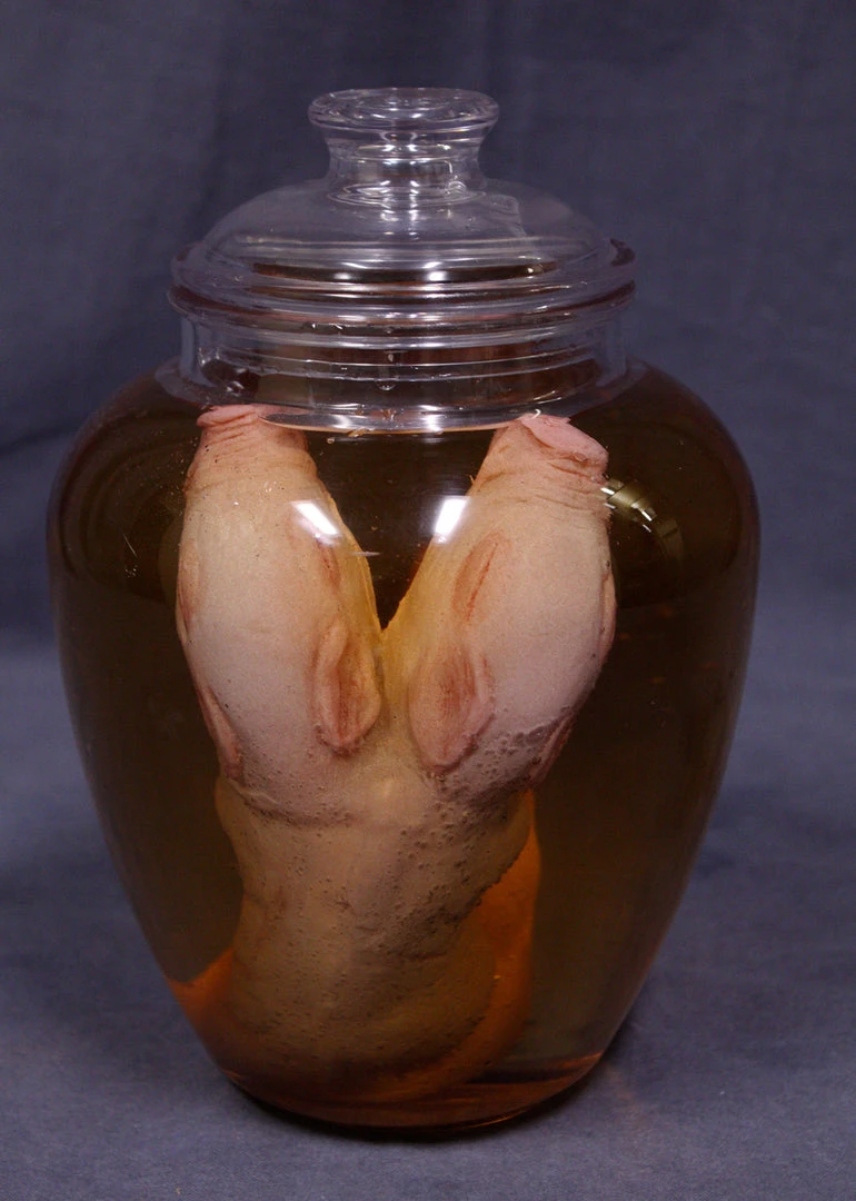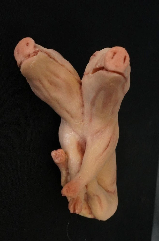 Realistically sculpted 2 headed pig fetus cast in solid rubber in a vintage style shatterproof acrylic apothecary jar. Perfect for any sideshow or curio cabinet.