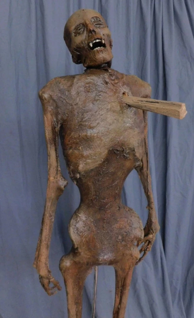 VMummified lifesize skeleton with super strong, super flexible, and super realistic skin. Skin is embedded with tear-resistant mesh. Great for situations such as haunts, escape rooms, and stunts, where stress and rough handling are expected.