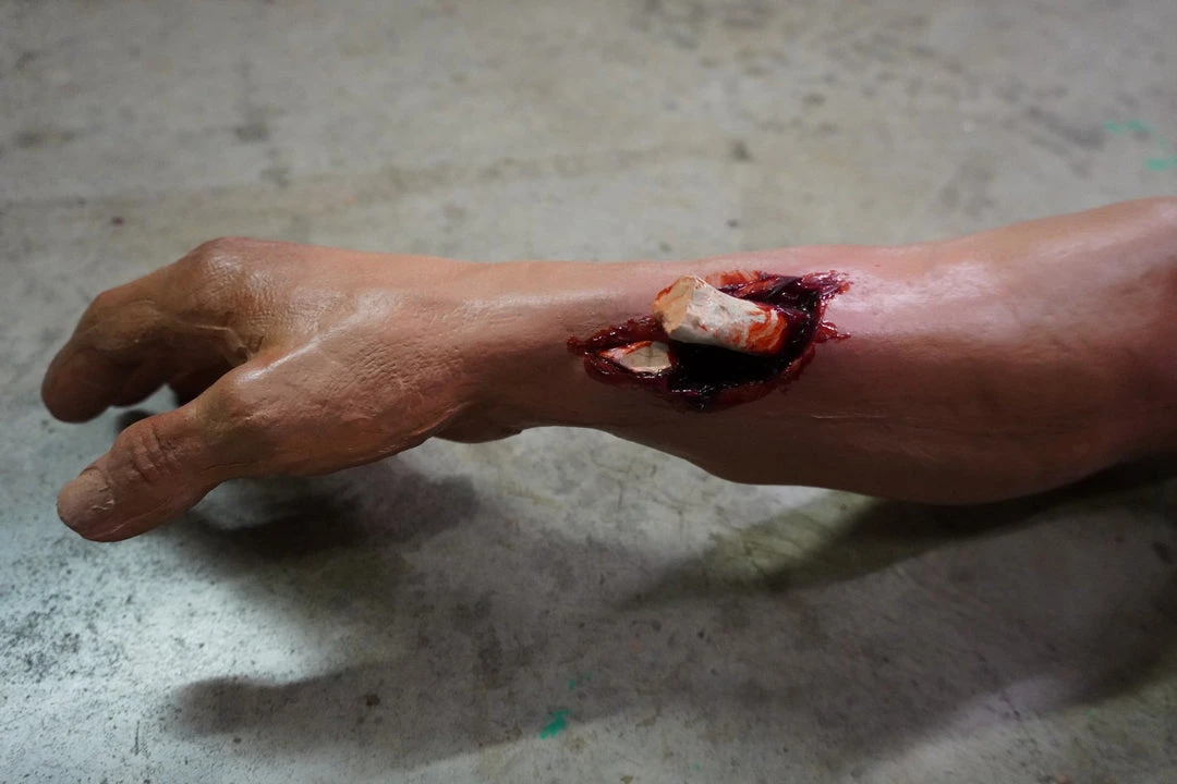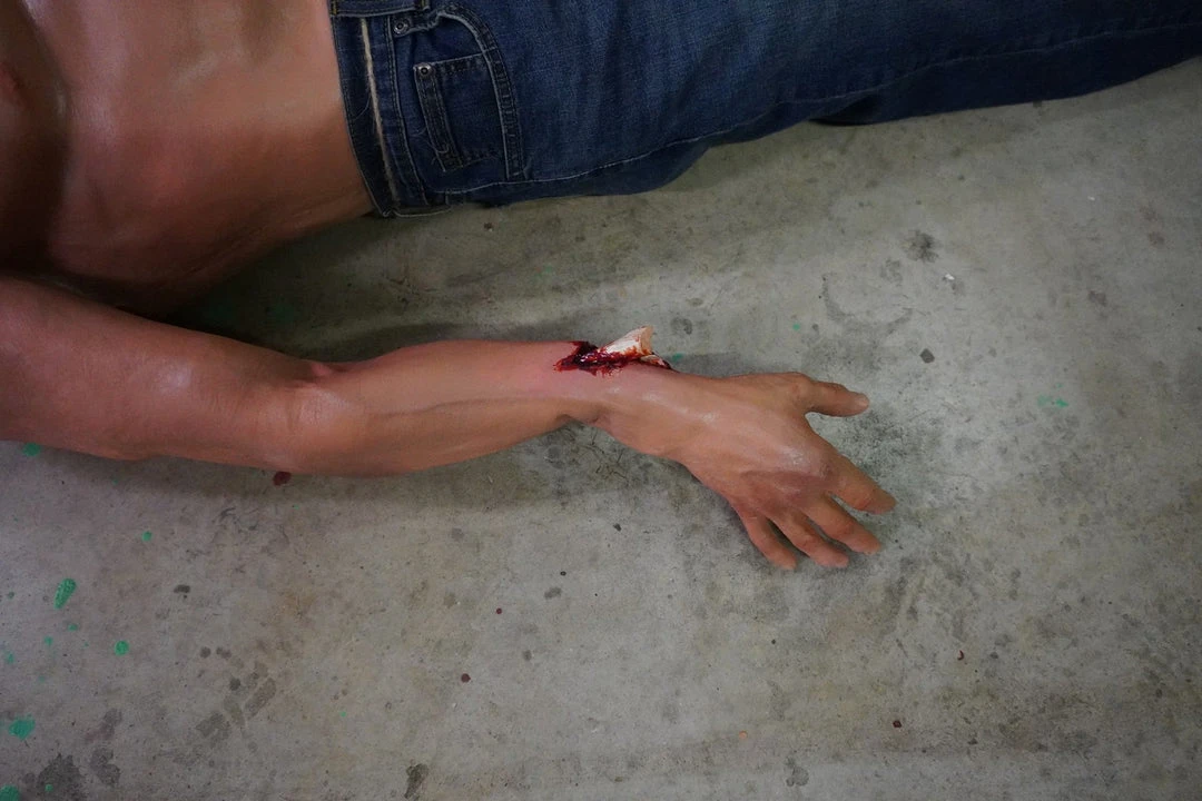 Lifecast Jack body with realistic wounds depicting a compound fracture in the right arm. Made with durable rubber skin and polyfoam. With facial hair and eyebrows. Shipping Dimensions: 72″ x 24″ x 12″