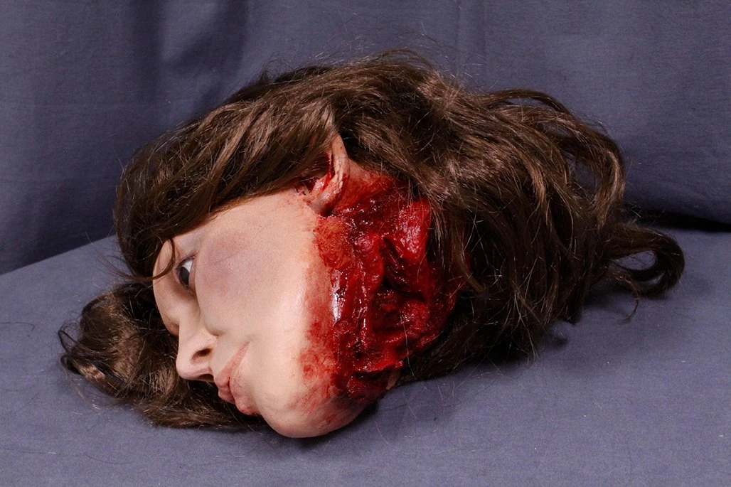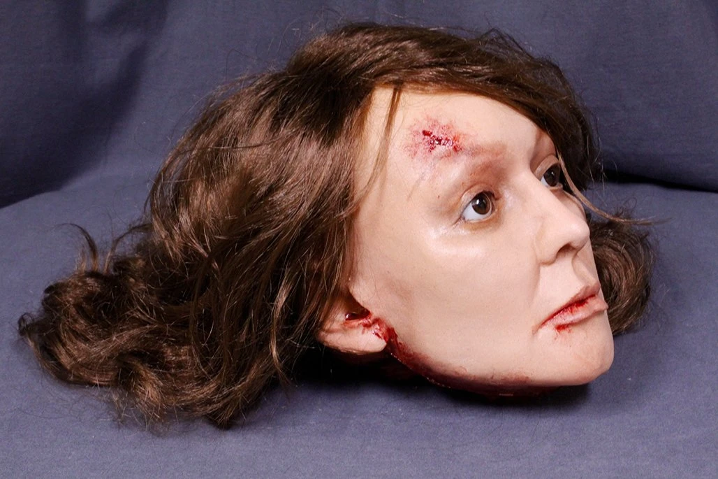 Lifecast female head with wounds.