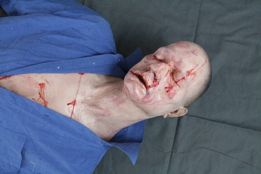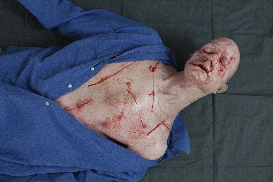 Slashed Alan Half Anatomical Dummy body features a lifecast upper body with poseable arms and a poseable dummy lower body with poseable waist and knees. Upper body also features knife inflicted slash wounds.