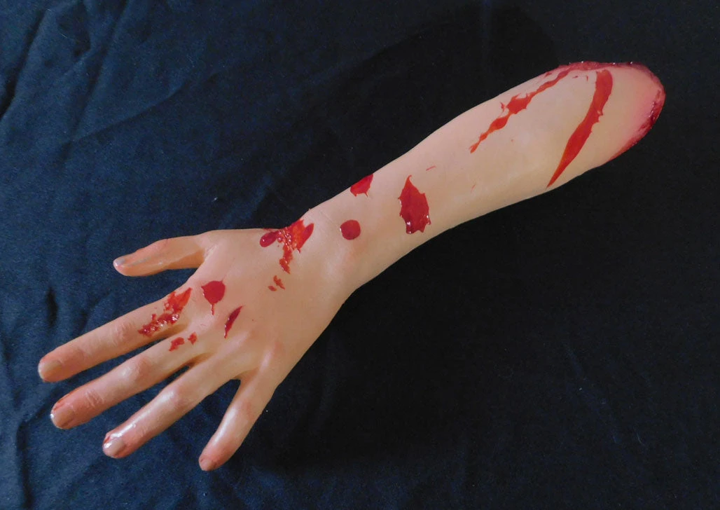 This left hand prop is a lifecast male arm with slightly spread fingers. Painted with blood splatter and gory stump. Polyfoam prop.
