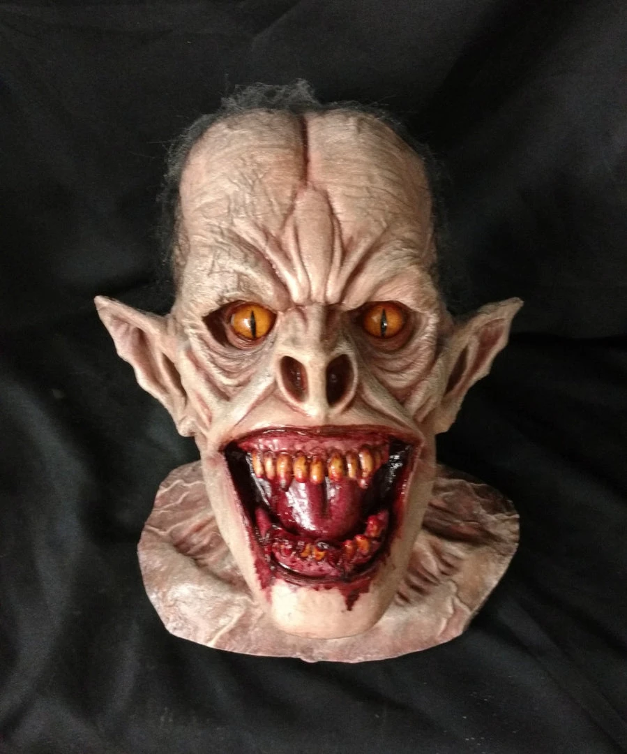 Demonic head with a open mouth, large fang-like teeth, large pointed ears and wild glass eyes.
