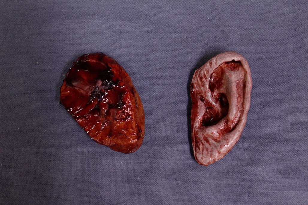 Decayed zombie ear with gory sliced off back. Available as a single ear or pair of ears.