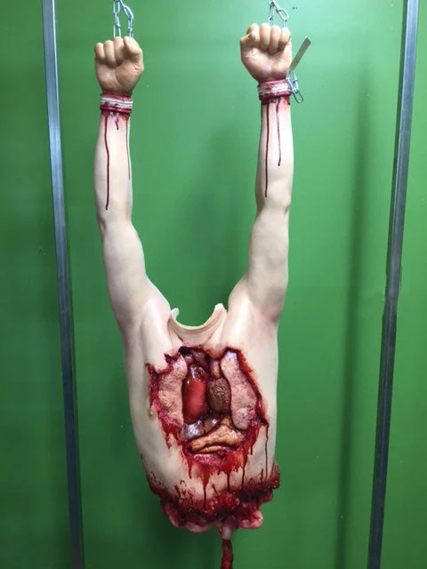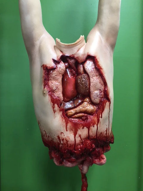 Fun photo op prop where an actor or guest can put their head through the curtain and their friends can take pictures of them as a zombie attack victim. Includes foam prop torso with ripped open chest and exposed organs. Reinforced internal armature.