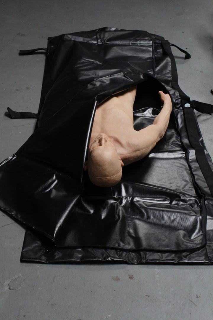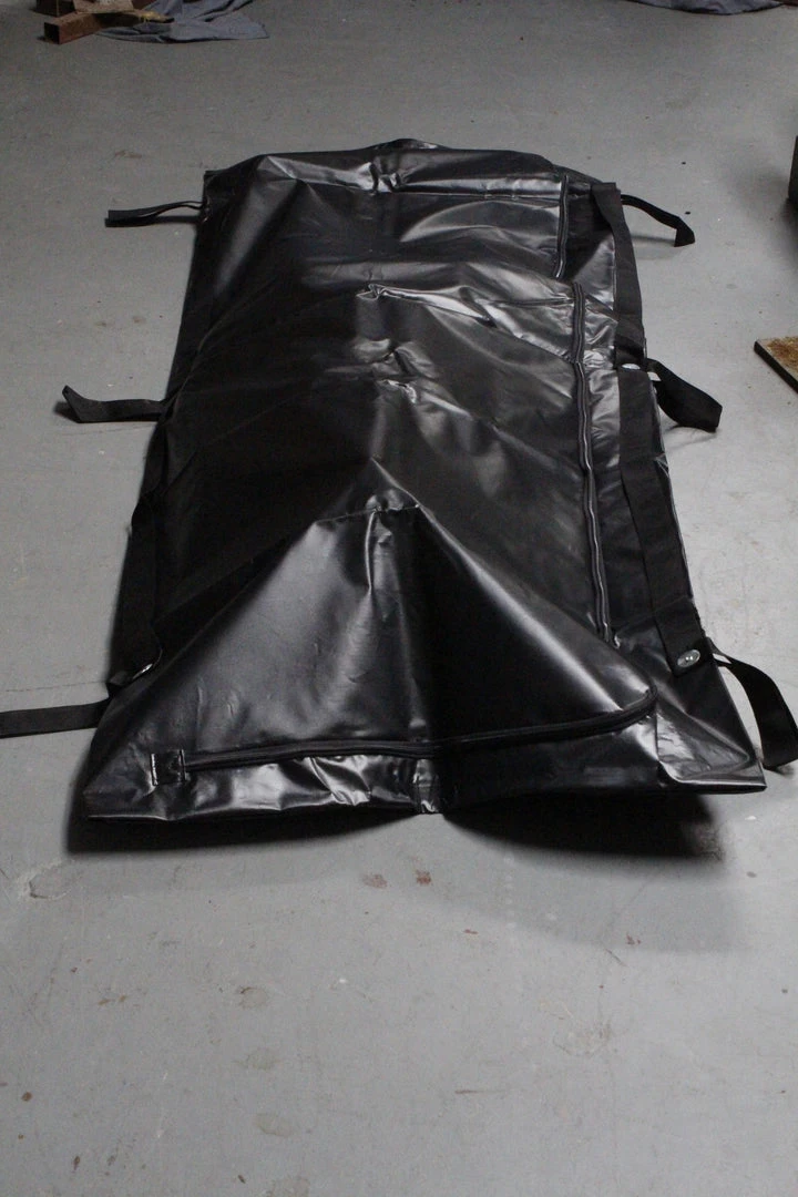 Heavy duty black vinyl body bag with strap handles. Body not included.