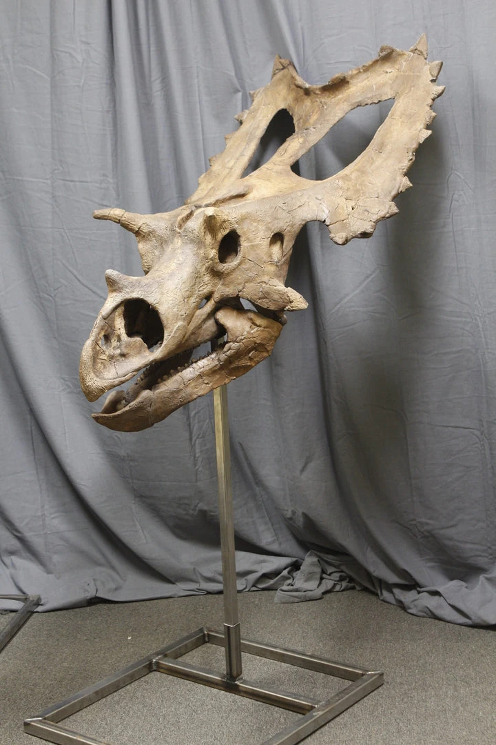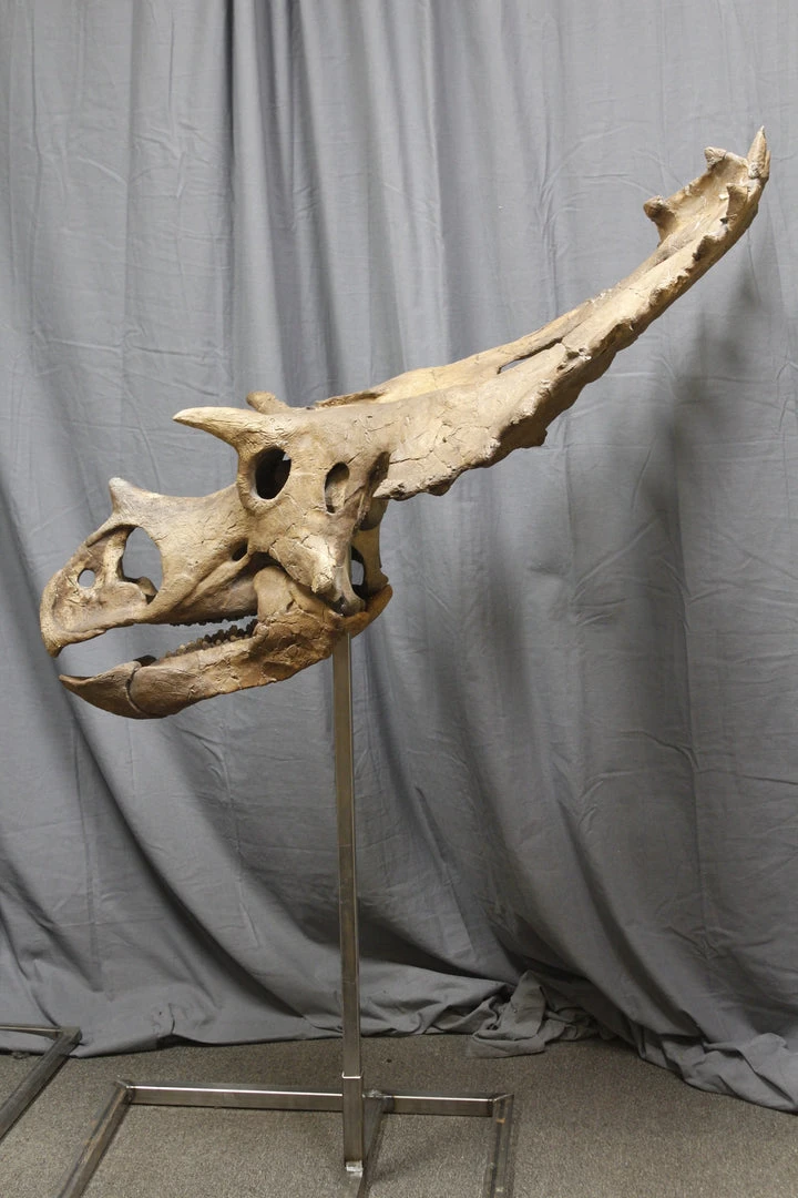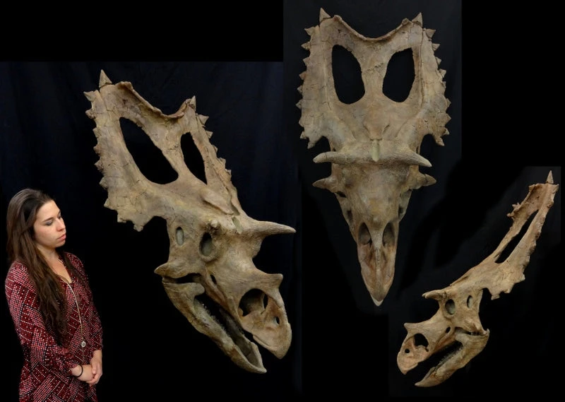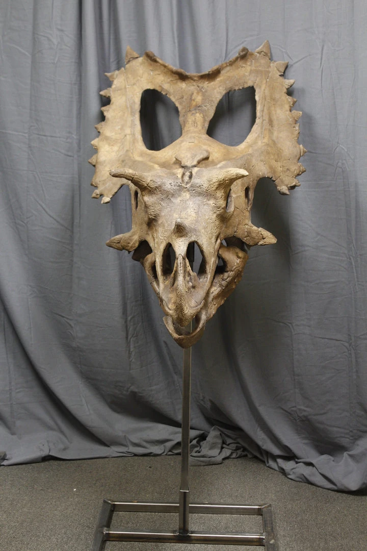 52″ long skull from a close relative of Triceratops found in Utah and known as the Utahceratops. Skull measures 52″ x 17″ x 29″ and is still considered a juvenile. Fully grown Utahceratops had skulls measuring over 7 feet long. This is a museum quality dinosaur skull casting. Includes steel display stand.