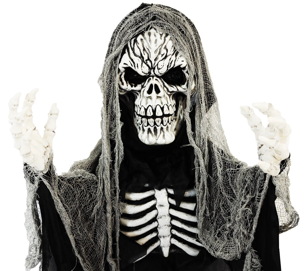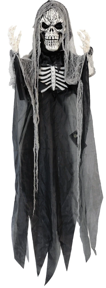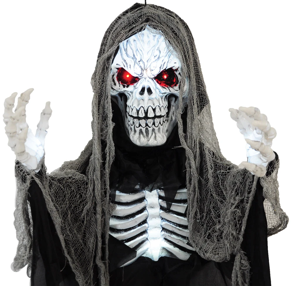 This scary hanging skull reaper has light up eyes, exposed ribcage and creepy gauze trim. Approximate dimensions: 72 x 47 x 8 inches. Requires 3 AAA batteries (not included).