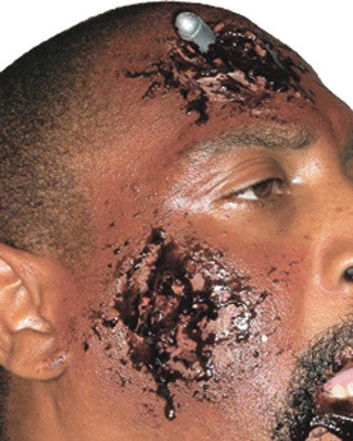 This kit includes: 1 Bullet Lodged in Wound Appliance, 2 Gunshot Entry Appliances, 1 Exit Wound Appliance, Blood Gel, Spirit Gum, Black Stipple Sponge, Undead Purple Cream Makeup, Bruised Red Cream Makeup. Everything you need to create the victim of multiple gunshots.