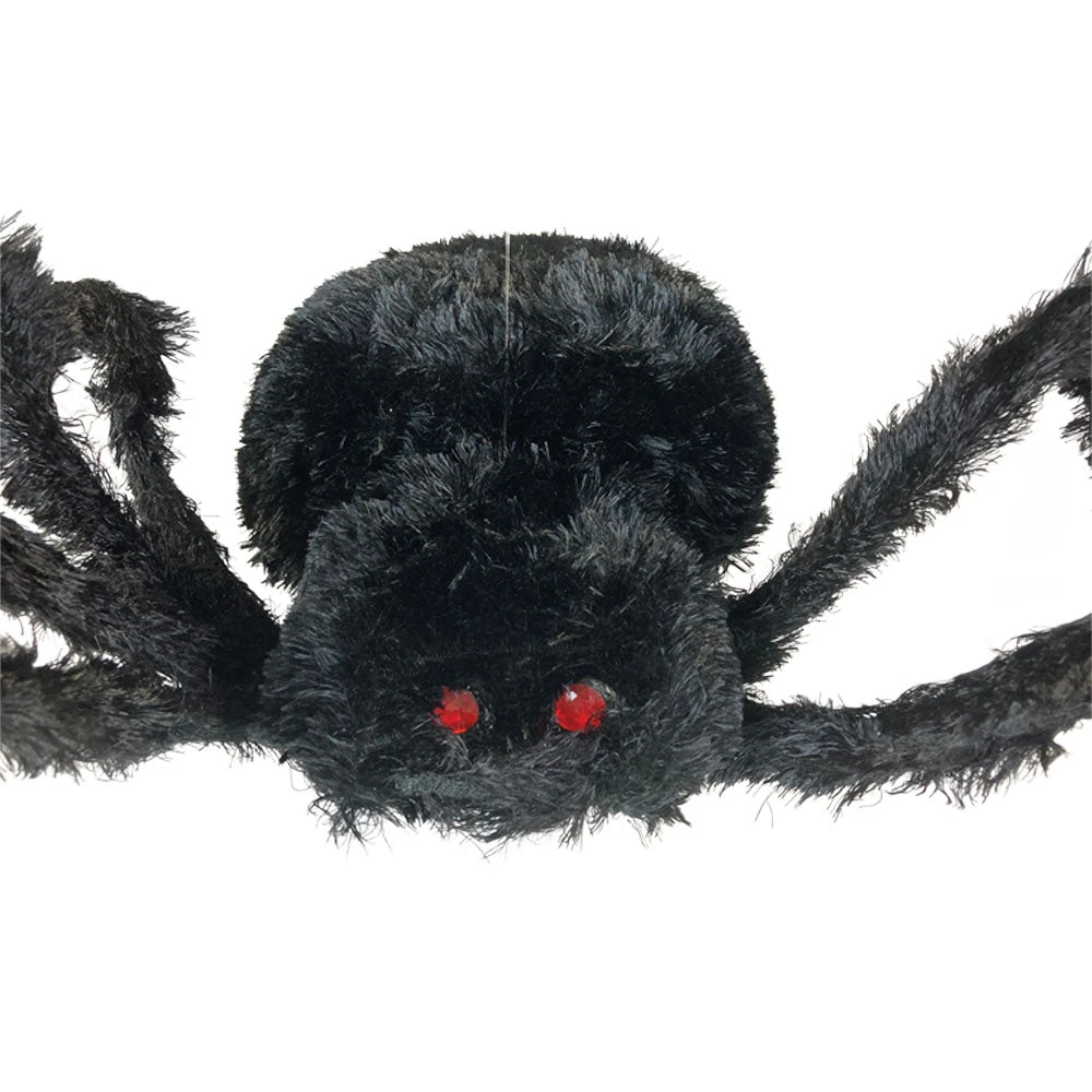 This polyfoam prop black fur spider with red eyes has legs that measure 25 feet across. Great Halloween room decoration. Body of the spider is approximately 13 x 17 x 6 inches.