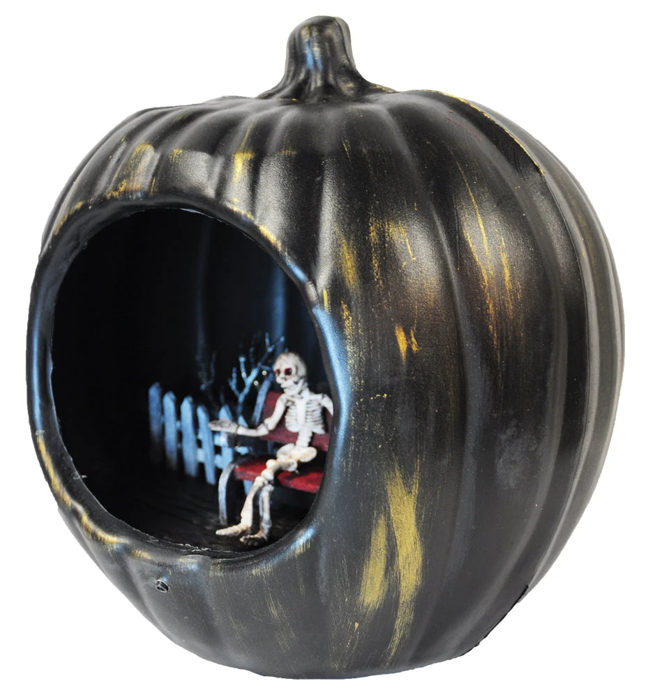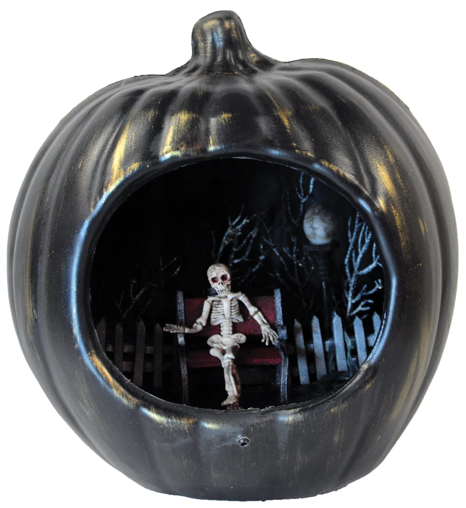 9 inch black painted pumpkin with spooky skeleton scene inside. It lights up and the skeleton shakes inside. Approximately 9 x 8.6 x 7.5 inches. Requires 3 AAA batteries (not included).