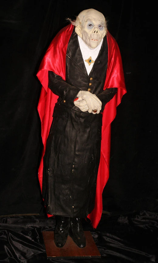 Lifesize free standing Count Dracula is dressed in his finest, including red silky cape and black dress shoes. His latex head and hands are realistically molded and cast a sickly pale green. Sturdily mounted on a wooden platform, this Drac is a great centerpiece for any haunted house or Halloween party. Dimensions: 68x20x15 – 15 lbs