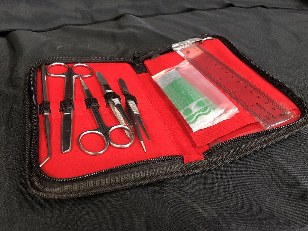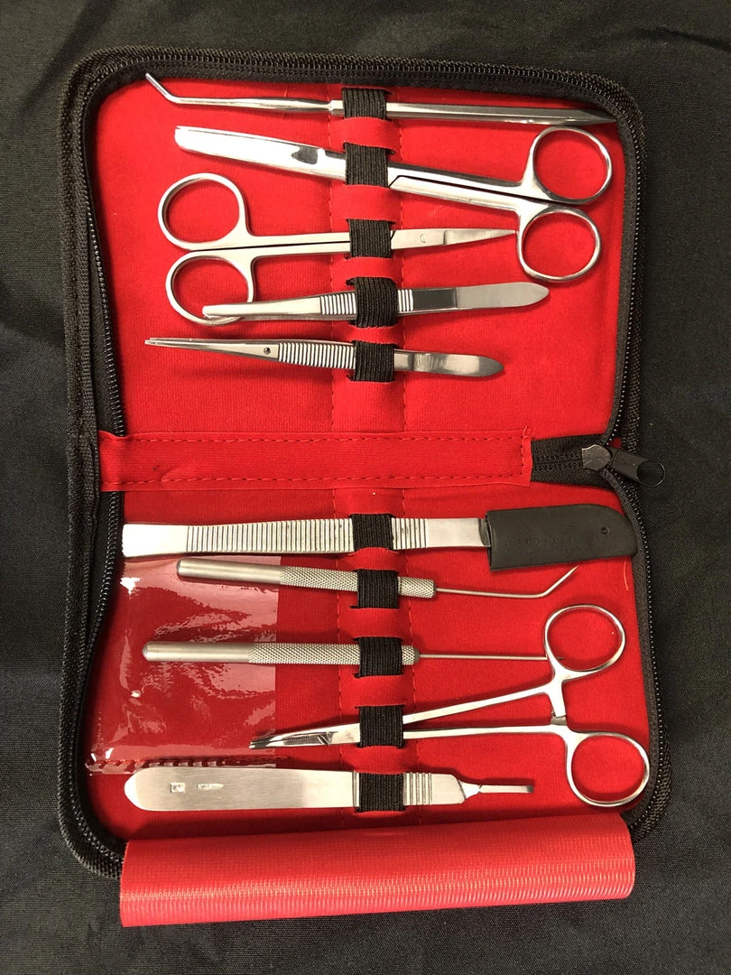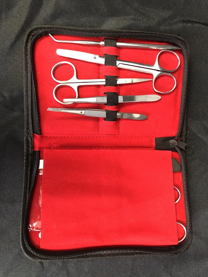 Advanced dissection tool kit typical for anatomy or med students. The black vinyl case with red velvet interior contains: