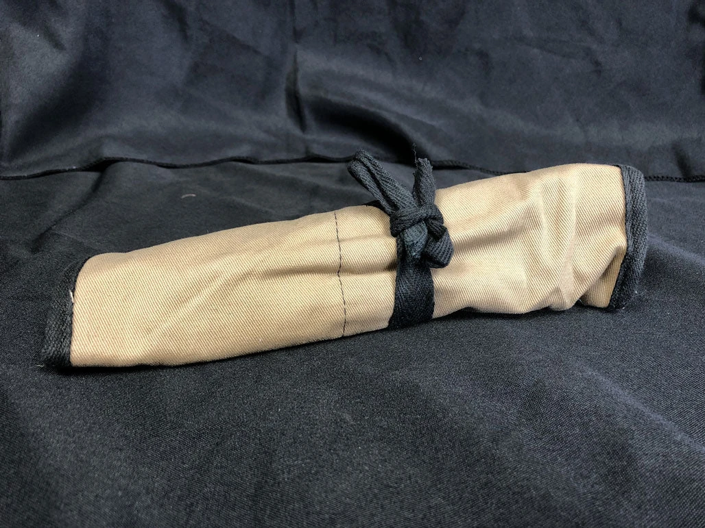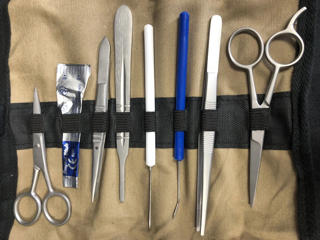 Veterinary surgical tool kit typical for vet students. The roll-up canvas case contains: