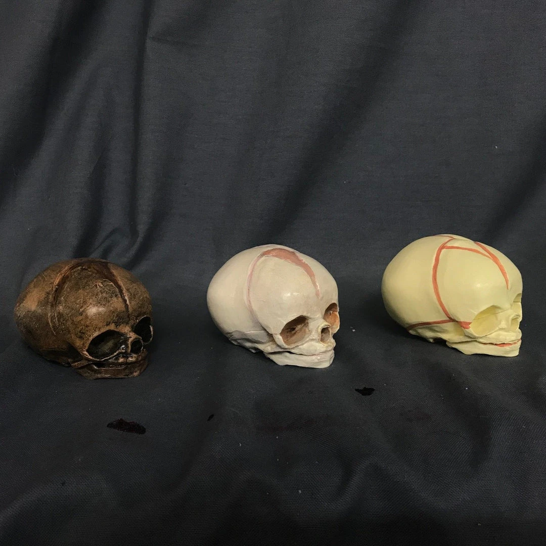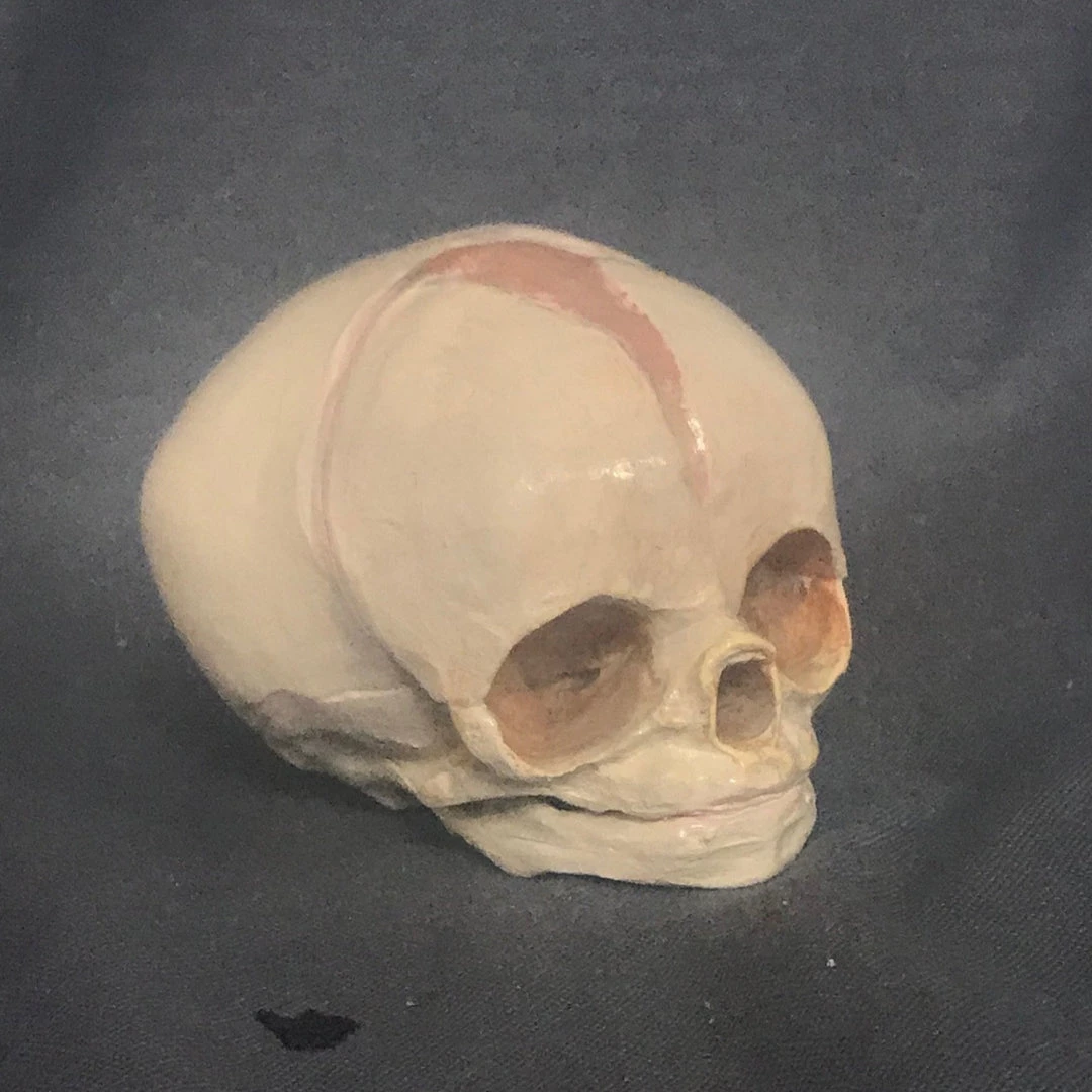 Lifecast fetal skull from a 3rd trimeseter specimen or newborn. Roughly 4″ long.