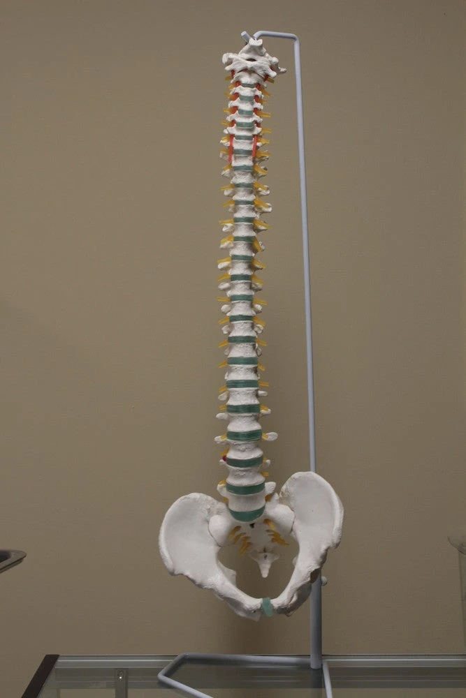 Lifesize human spine and pelvis hanging on a metal stand.