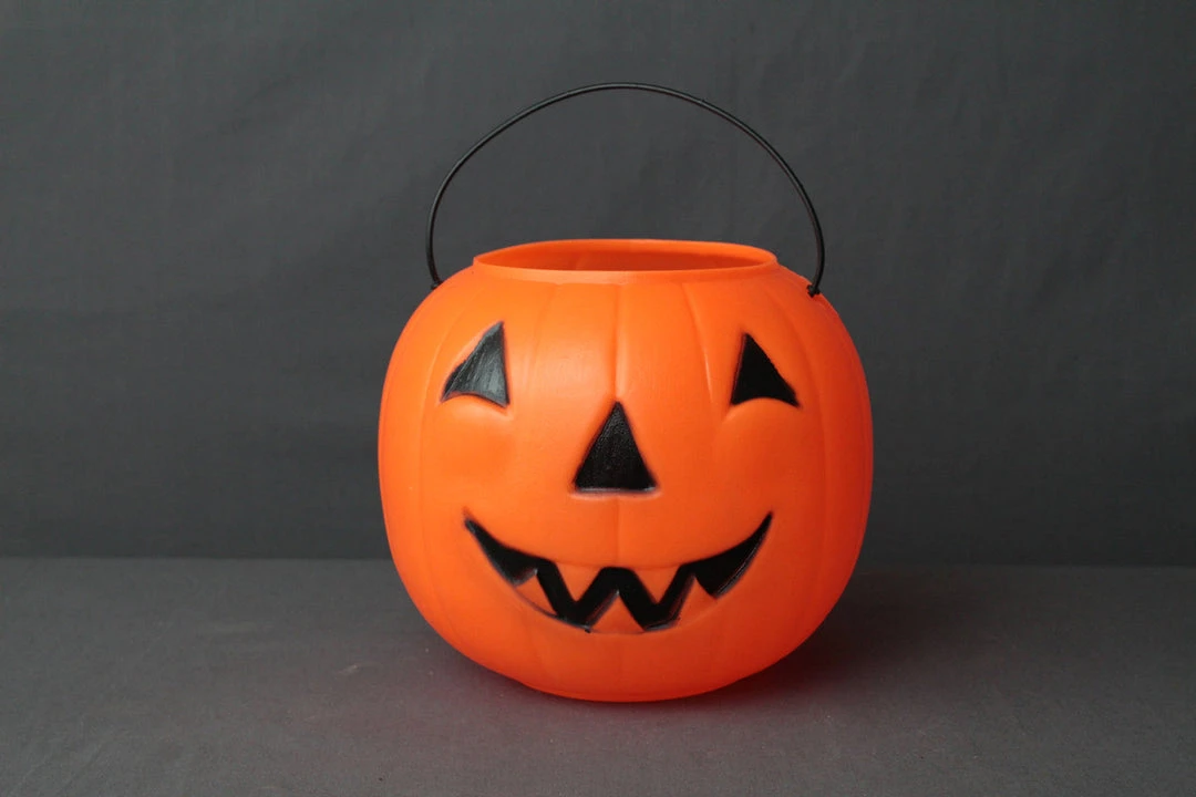 Classic blow molded 7″ orange pumpkin bucket for trick or treating.