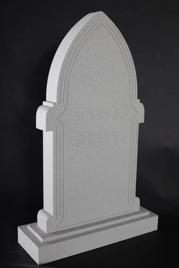 This headstone is made of closed cell foam rubber with a waterproof hardcoating of Dryloc latex cement. The hardcoating is tinted white and detailed by hand. It comes with a removable base for added realism and stability, and contains 2 pvc channels for easy mounting in the yard. This headstone reads “Susan Shelley 1914 – 1945”. Dimensions: 32″ x 16″ x 3″